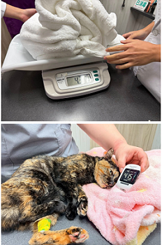,且有脫水症狀,在沐恩先打皮下200ml, 腹部超音波無腹水,X光 正常,口腔正常,需先觀察有沒有吐、拉肚子。如可以的話,可帶糞便來檢驗,看有無寄生蟲。後再於同月27號回診, 尿檢後發現腎及肝有發炎,且輸尿管不順,評估可能有潛在病毒或細菌感染,先使用抗生素治療若無嘔吐再餵驅蟲藥。