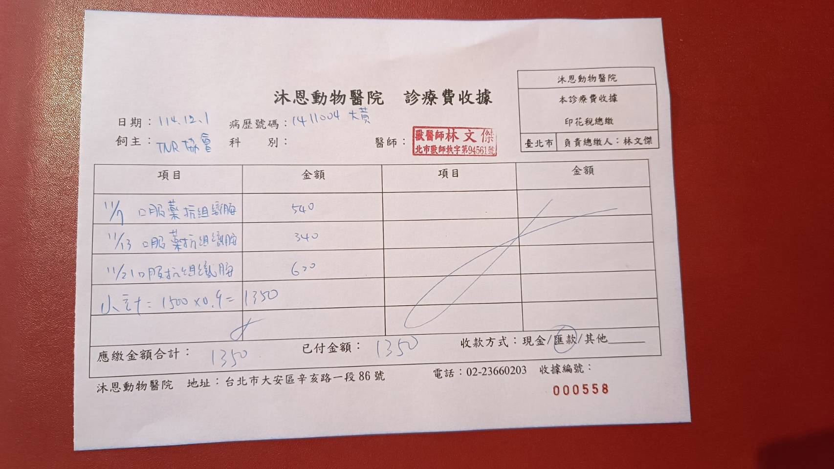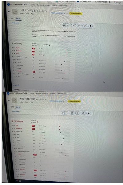 在外面找大黃半天,大白叫到喉嚨都要破了,工作人員告知在後面的儲物區塑膠抽屜上,發現躲在紙箱後面不動的大黃...不知道是不是生病了?於是拿網子圍捕,捕抓送醫檢查。就醫檢查有發炎現象,因捕抓不易、順便檢查胸腔、口腔有無問題並進行拔牙,後因為下痢及精神與食慾都不佳,住院治療近三週,狀況穩定後出院接回安養之家照顧。在苗栗安養之家居住多年,因發現大黃體型消瘦且淚眼不斷,因此隨著苗栗貓屋全數遷移回台北安養之家時,一併安排就醫檢查,在2025年12月30日於沐恩醫院看診發現,大黃有一邊腎偏小,血檢結果為腎衰,在醫院當下便先行施打乳酸林格100ml,目前先回去觀察進食狀況,1月開始需全面將飲食改為腎處方飼料並給予食慾促進劑看是否能將食慾提升。同時因大黃有淚眼鼻涕狀況需每天噴霧舒緩症狀。本筆醫助是大黃自2025年12月1日至2026年1月6日間,於沐恩醫院看診的費用,包含血檢及用藥。