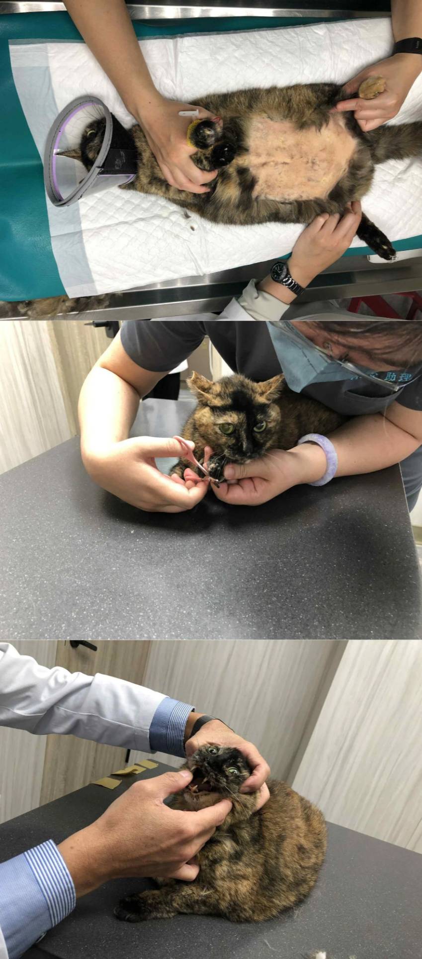 2020年5月初,照護員發現玳瑁奶媽嘴邊流口水、精神食慾也不好,於是由台北工作人員前往接至沐恩醫院檢查,有明顯的牙結石,多顆牙齒鬆動,甚至在檢查時就掉了2顆牙,血檢結果肝腎血糖都沒有特別問題,於是安排在5月14日先住院打點滴,5月15日進行牙周手術,總共拔了7顆牙及2顆牙根殘留、三處皮瓣縫合,術後住院打點滴及觀察,5月16日進食情況順利,便辦理出院接回安養之家照顧,至目前恢復情況良好,食慾也沒有問題,雖然偶爾還是小緊張,但只要照護員伸手摸摸,就會開心的蹭蹭甚至翻肚子,模樣非常可愛,現在牙齒不痛了已經可以將她帶回大湖安養之家,希望回到熟悉的環境、嘴巴的不適消除,玳瑁奶媽可以大口吃飯、開心玩耍。