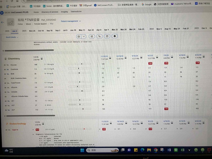 近期2025年9月2日回診追蹤並加驗甲狀腺加驗,發現指數超出標準如食慾精神變差就先不吃低劑量甲狀腺藥物,腎指數須持續追蹤。2個禮拜後9月16日再度回診後指數正常,甲狀腺藥對控制有幫助就持續用藥一個月後再回診,但若有精神活動力變差就要提前回診。
