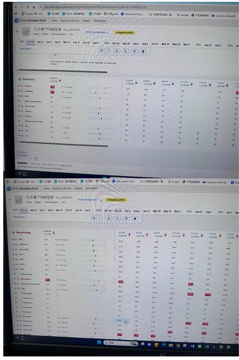2025年1月6日回診,回診前幾天有嘔吐多次、開始吃胃藥,但仍有嘔吐情況,醫師再增開止吐藥,血檢指數都在標準範圍內,未發現與嘔吐有關的異常,懷疑可能還是吃藥引起的不適,就先觀察吃止吐藥後是否有幫助。