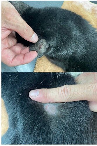 2025年3月6日因照護員摸到周全身上有幾個很小的瘤,至沐恩檢查結果,因其中三個瘤太小無法採樣,只有左腋下靠近胸口的瘤較大一些,採樣後顯微鏡下有看到活躍的細胞但數量太少,這樣無法準確判斷,醫師表示因摸起來有點硬,有可能的是三種情況,1.皮膚型淋巴癌,比較沒那麼惡性,通常切除就好。2.肥大細胞瘤。3.良性腫瘤。就先再觀察一個月,