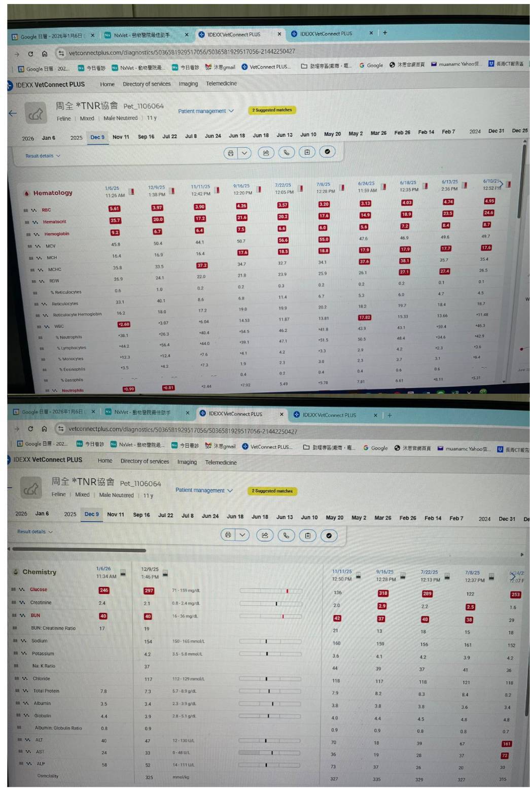 2026年1月6日於沐恩醫院進行回診,此次血檢紅血球指數順利回升,因此每週一次的肌肉注射造血針可停止。但這次周全皮膚上有搔癢抓傷狀況,可每天一次溫水擦拭清潔。後因一月中旬時周全有連續多日嘔吐狀況,於1月19日至沐恩醫院拿取吐制酸針劑用藥,再持續觀察嘔吐狀況是否改善。