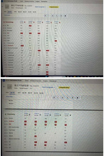 2025年12月26日於沐恩醫院回診,此次醫師協助幫忙剪指甲。其他指數皆超出於標準範圍,尤其磷離子升高到9.5,需加吃腎利磷,因過高會較難維持腎功能。後因善法連日不吃飯,且分別有吐乾飼料和黃水,因此安排2026年1月19日就醫檢查。觸診沒有異常。體溫也正常。先開立止吐及針制酸劑針,同時須施打皮下每天一次,每次150ml,食欲進步改打100ml,食慾恢復正常可停。