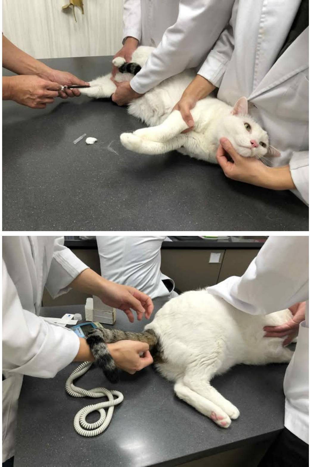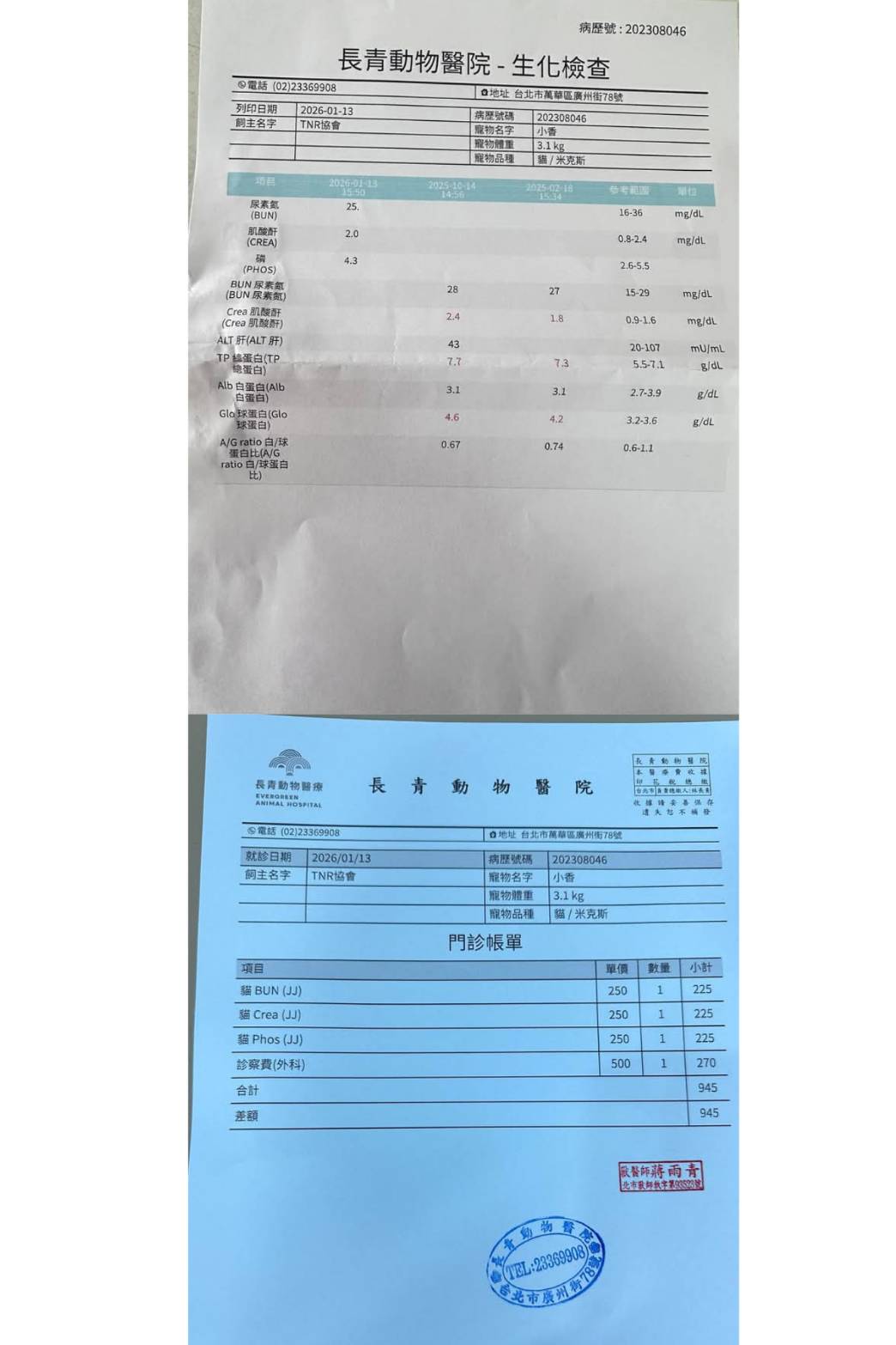 經過數月的耳朵清潔、至長青醫院回診追蹤檢查,小香左耳一直有保持乾淨,但右耳恢復就比較慢,期間也追蹤血檢,在2024年2月間回診因體重有慢慢減輕及腎指數也有升高,照護員收集小香尿液於2024年4月2日回診時讓醫師做尿檢,檢查結果尿蛋白有比較高一些,腎功能應還是有受損,耳朵檢查右耳已經沒有看到膿液,但仍有較多髒垢,還是需要持續的定期以清耳液清潔,而2024年4月底回診的X光檢查,發現小腸腸壁增厚、一顆腎臟有萎縮情形,做超音波檢查,整個腸胃道淋巴都腫、胰臟也腫及12指腸潰瘍,此情況可能與免疫性腸炎或是腫瘤有關,但要確診須採樣,就先觀察看看,還好至2024年7月2日的回診,超音波檢查結果,小腸壁及淋巴結的狀況都有變好,推測可能與期間食物變動有關,醫師建議就先不要更換目前的食物;耳朵檢查,右耳也更乾淨了,但還是必須維持原有的清耳朵方式,以求保持狀況穩定。本筆醫助是自2026年1月13日於長青醫院回診的費用,包含血檢的費用。