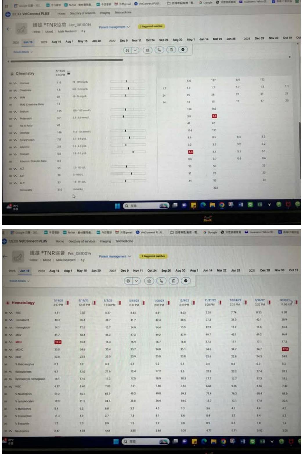 2026年1月發現鐵雄因食慾不振,且腹瀉及吐血絲口水,因此安排2026年1月19日於沐恩醫院看診,血檢顯示白血球指數雖還在正常範圍內,但降低許多,需持續觀察,其他指數則無異常。在醫院先施打林格液、抗生素針與止吐針,並開立藥物回協會持續用藥並灌食。現鐵雄已逐漸恢復食慾可自主進食。本筆醫助是2026年1月19日於沐恩醫院的費用,包含看診血檢及用藥。