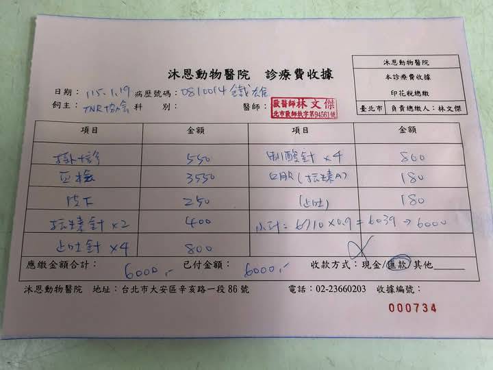 主題: 嘔吐腹瀉的鐵雄及定期追蹤的小香 申請者姓名: TNR協會 花色: 白底虎班 申請日期: 2026-02-02 13:44:14 申請者部落格: https://www.facebook.com/SupportTNR/?locale=zh_TW 申請者臉書網址: https://www.facebook.com/SupportTNR/?locale=zh_TW 所在縣市/合作醫院: 台北市/沐恩動物醫院 治療費用: 7800元 需求名額: 26人 平均每單位: 300元 已報名名額: 26 尚需求名額: 0 報名人員: 1.Ai x5 (已付款)