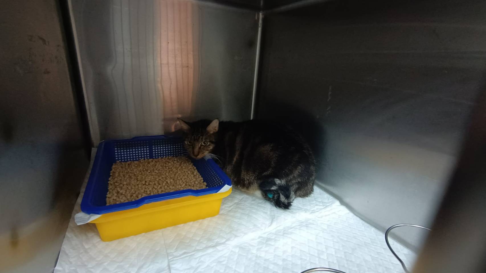 2025年6月8日,六六轉至沐恩動物醫院持續治療,做X光、超音波檢查、住氧氣室吸氧、打靜脈注射,第一天身上有很多跳蚤,噴除蚤藥,之後幾天也投藥驅除體內寄生蟲,六六因頭部受創、意識不清,無法自己進食,所以裝食道胃管也每天都要做血壓監測、打皮下輸液,在X光檢查還發現,六六懷孕了,肚子裡有5-6隻的小寶寶,這讓人很擔心緊張,六六本身狀況還相當不穩定,能否安然度過孕期或順利生產都是未知數,就先以穩定六六的情況為主,還好隨著用藥醫療,六六漸漸的會搖搖晃晃的走路、走走停停,2025年6月15日已不用再住氧氣室、可移到一般病房,用藥也增加了補血針劑,2025年6月21日的X光檢查可見有5個小寶寶團,還好六六已經開始會自己吃較軟的食物,不用全天灌食,也能自己到貓砂盆,只是消化道狀況還不夠穩定,再多觀察幾日,希望可以順利出院照護。 原本2025年6月底已能自己部份進食,也能使用貓砂,醫師認為狀況有改善可以出院,但六六嘔吐兩次,表示消化道仍不夠穩定,因此再留院幾日觀察。