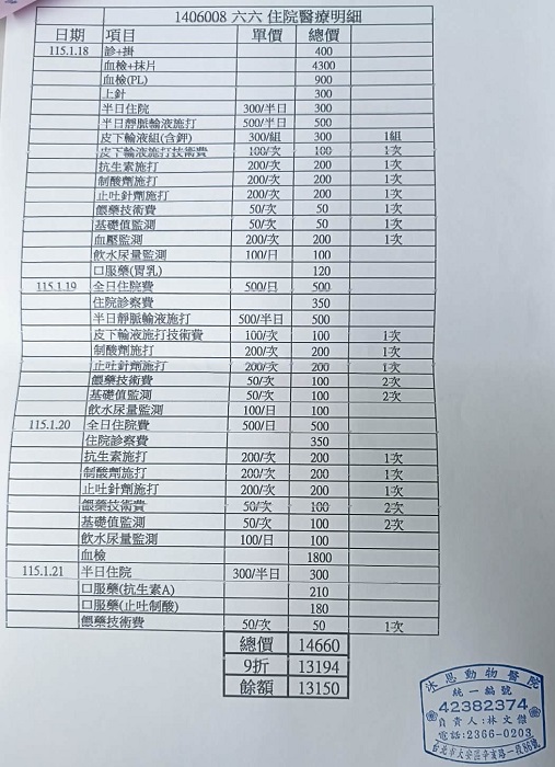 2026年一月因照護員發現六六精神不佳且食慾不振,並有嘔吐狀況,因此安排於2026年1月18日沐恩醫院看診,看診發現六六發燒於是安排當下住院觀察,經幾天觀察後六六已無大礙於1月21日出院,現已回到安養之家接受照護。