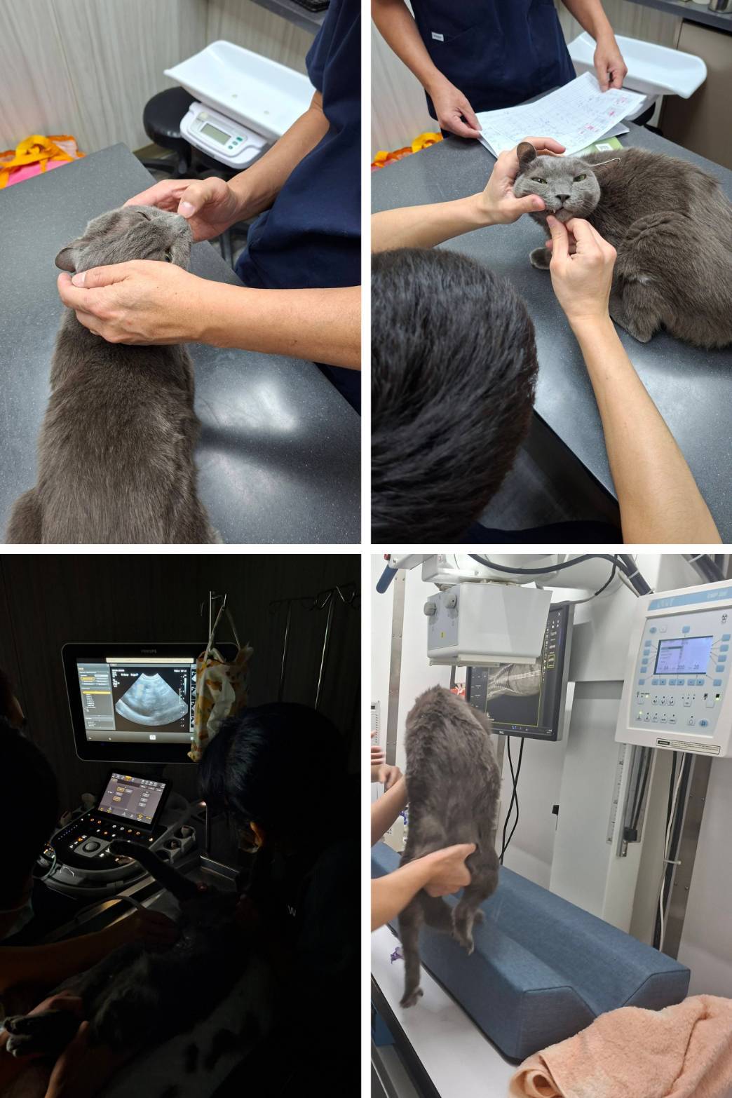 2024年2月15日連續嘔吐,先向醫院拿回制酸止吐針及打皮下輸液,但2月16日早上精神仍不好,因此臨時回診檢查,肛門處的毛有些沾到髒髒的,應是也有拉肚子。血檢結果,胰臟炎陰性,白血球升高於正常值,以檢查結果研判是腸胃炎,開抗生素針劑,為了讓消化道休息,原本的醫院用藥及肝藥都先停,同時因有噴濃鼻涕,採樣送細菌培養。