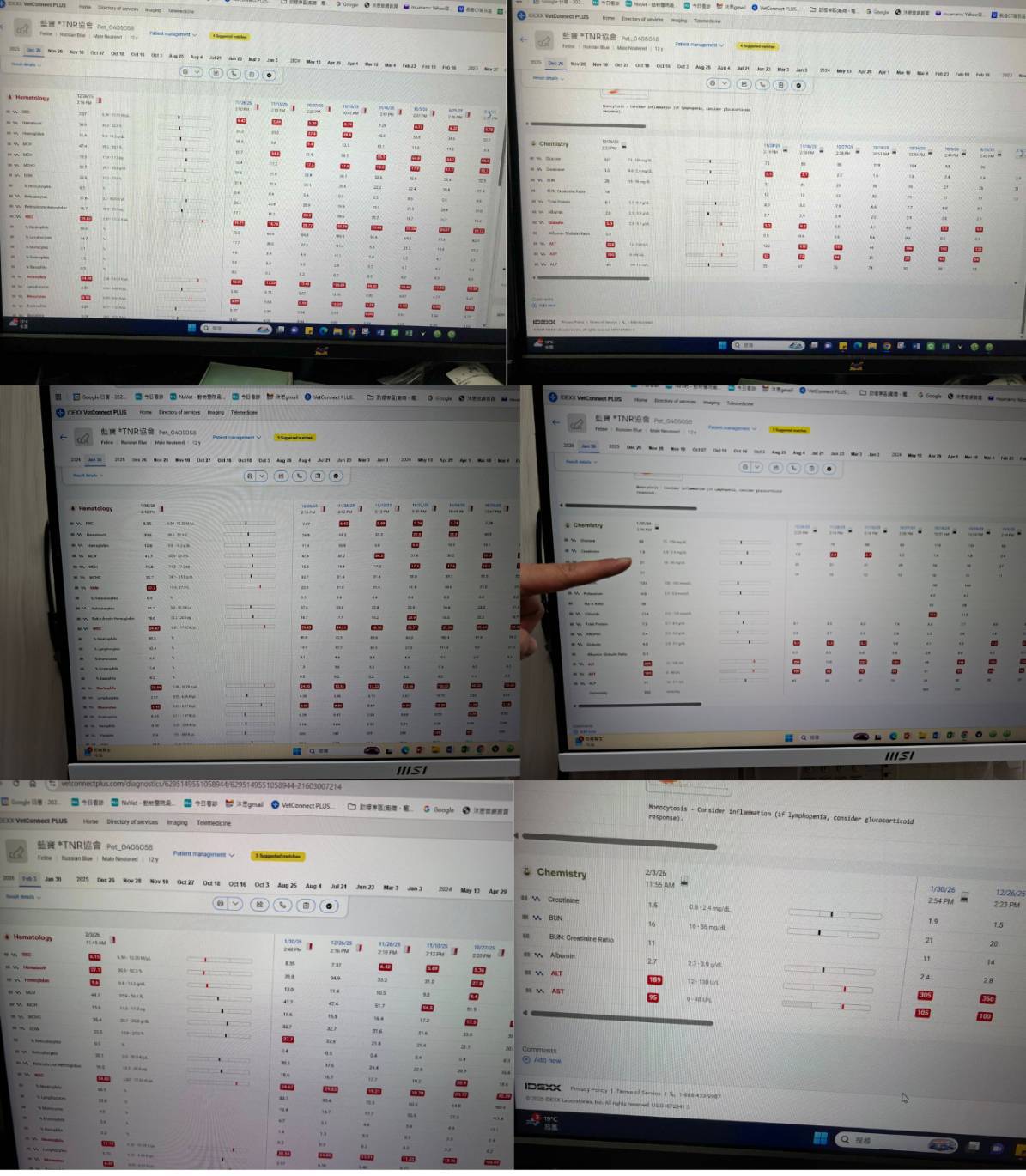 2025年12月26日於沐恩回診,血檢部分 白血球及肝指數皆高於正常值須注意,但因目前腎指數正常所以先暫不開立抗生素治療。一月中旬左右,因藍寶持續嘔吐不斷,且有腹瀉脫水現象,於1月26日沐恩看診,血檢結果肝指數上升、超音波顯示淋巴結腫脹嚴重,於是立即安排當下住院觀察,院長表示懷疑是淋巴腺腫瘤,考慮年後安排手術採樣,確定病因。後於2月2日住院期間排便已恢復正常,在2月3日安排出院,須持續用藥及施打皮下,同時飲食部分須將飼料改為MFLD27以及固定罐頭種類,不可給其他食物及零食。