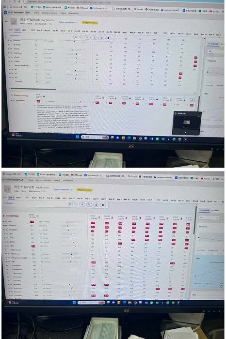 完成肥大細胞瘤的手術後,持續於沐恩醫院治療血糖,每隔一或二週就須回診留院幾小時測量血糖,原本因糖尿病被限制飲食的周全每餐都是立刻吃光光,但2025年2月7日突然異常的沒有立刻將飯吃光,精神也不大好,臨時至沐恩醫院檢查結果,果肝指數突然升高很多,超音波檢查肝臟未發現腫塊跡象,但腹腔影像偏亮疑似有發炎,先調整用藥並增加吃肝臟保健品,還好看診後食慾有恢復正常,醫師懷疑肝指數升高可能是與血糖高有關,腎指數也受到影響開始升高。