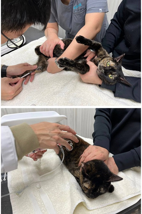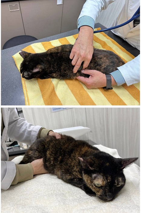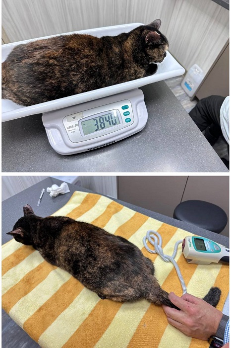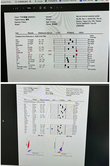 2025年6月11日,黛咪因每週日的固定測量體重逐漸減輕,又眼睛分泌物多、結膜紅及有濃鼻涕,還有右後腳底摸起來有點泡泡,約診木恩醫院檢查,觸診後腳略為泡泡的但沒有發現傷口,血檢結果,發炎指數及肝指數都升高,X光檢查並沒有發現異常,超音波檢查肝臟沒有發現腫瘤影像,但沒有看到膽的影像,而黛咪來到協會後並未做過膽摘除手術,這樣情況除了是膽有纖維化造成與旁邊組織的辨認度變差,或是膽囊曾破裂沒有脹大,因血檢顯示並不像肝臟有急性發炎,所以就先吃抗生素,除了對呼吸道有效果,若肝指數升高是細菌感染引起及腳底泡泡的是發炎都也會有效果,同時也有促進食慾功能,眼睛則點抗生素眼藥水及人工淚液。