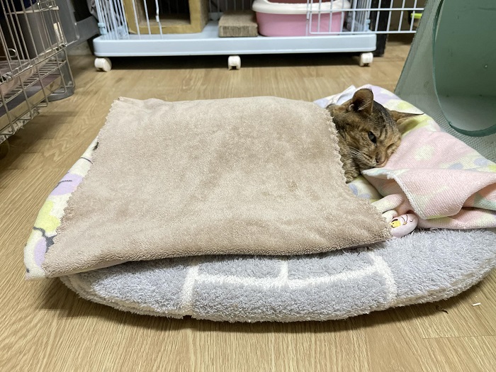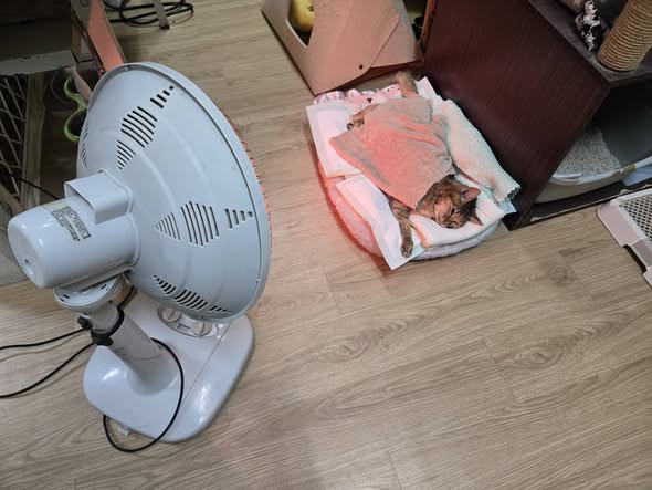 2024年12月中旬因食慾精神變差、身體微微抖臨時至沐恩醫院回診,雖聽診心音沒有異常,但呼吸稍快且血壓偏高,X光檢查發現心臟輪廓變大,再加驗心臟快篩結果是異常,再做超音波檢查發現有極少胸水,當天住院以調整用藥及較密集的監控呼吸、心跳、血壓的變化,醫師診斷阿咪是肥厚性心肌症、伴隨心率過快,造成體內循環差,同時有高血壓及腎指數持續升高,住院期間吃心臟藥後,血壓呼吸都有逐漸改善,在2024年12月18日辦理出院。