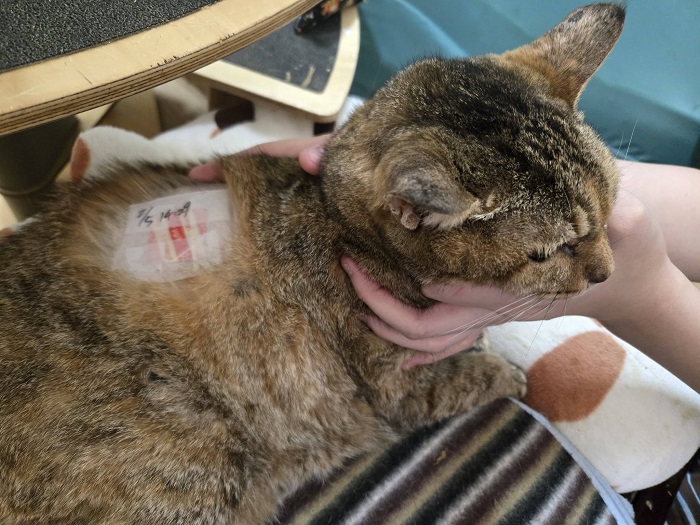 在2024年1月間阿咪因體型明顯變瘦,於2024年1月5日至沐恩醫院檢查,血檢結果腎指數及肝指數都高、有些脫水,口腔檢查發現左上犬齒牙齦腫起一包並有一個小傷口,X光檢查胸腔腹腔沒有明顯異常,整體檢查結果,主要是腎衰及牙周問題,只是在脫水及腎臟問題未處理好之前,不宜接受麻醉手術,所以先打皮下輸液、吃食促,二週後回診紅血球指數下降及磷上升指數,增加打造血針及吃降磷藥,治療至內科狀況較為穩定後,於2024年3月19日進行牙周手術,因腎指數仍是較高、麻醉手術不宜過長時間,所以手術只拔除狀況較差的四顆牙齒,完成牙周手術後仍持續回診治療肝腎指數問題,為了幫助阿咪的健康能更穩定,也開始做胜肽治療。