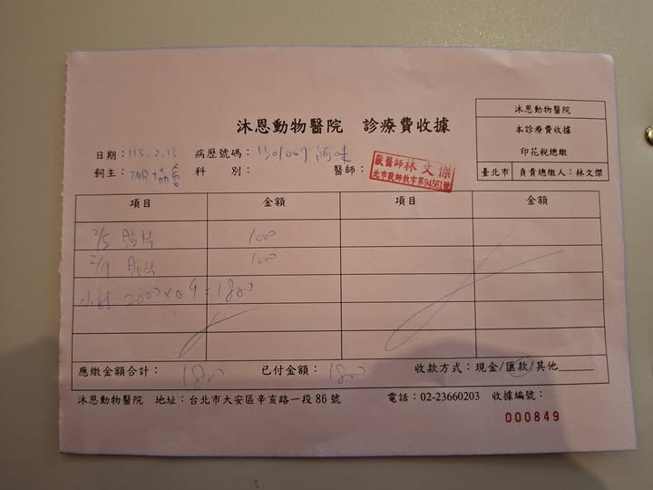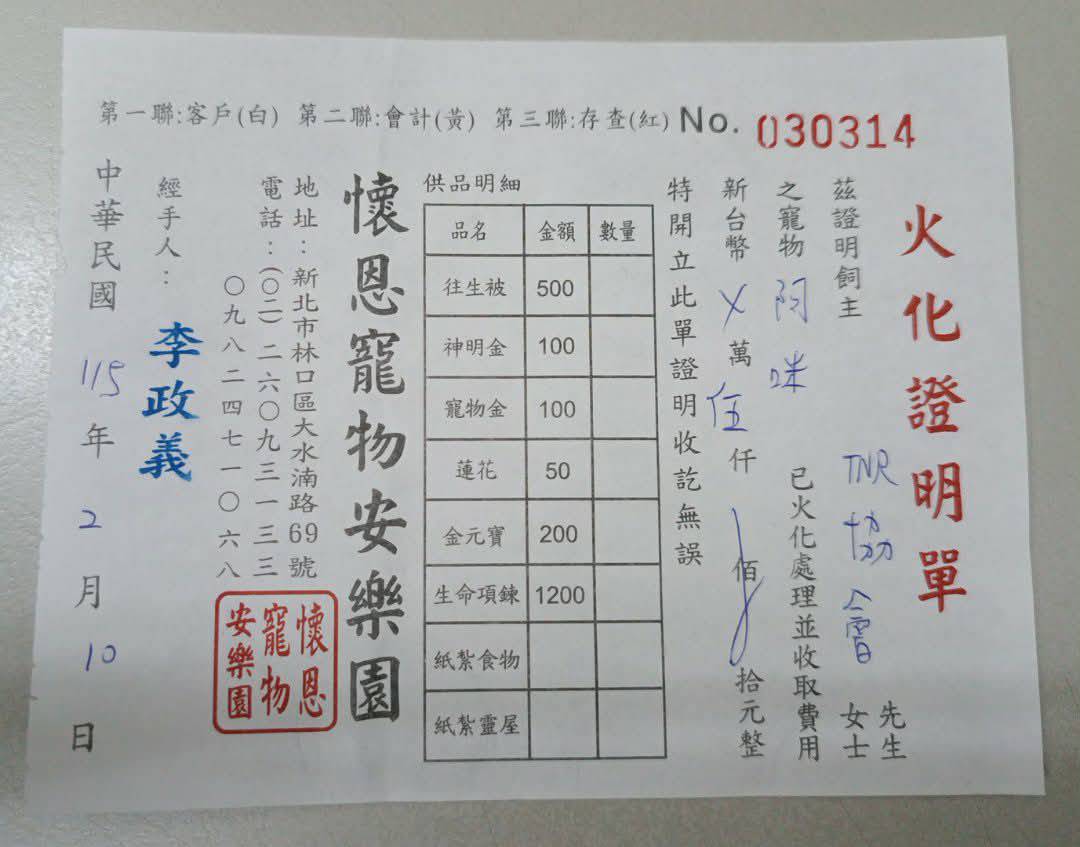 2026/2/10 阿咪 懷恩寵物安樂園 $5000