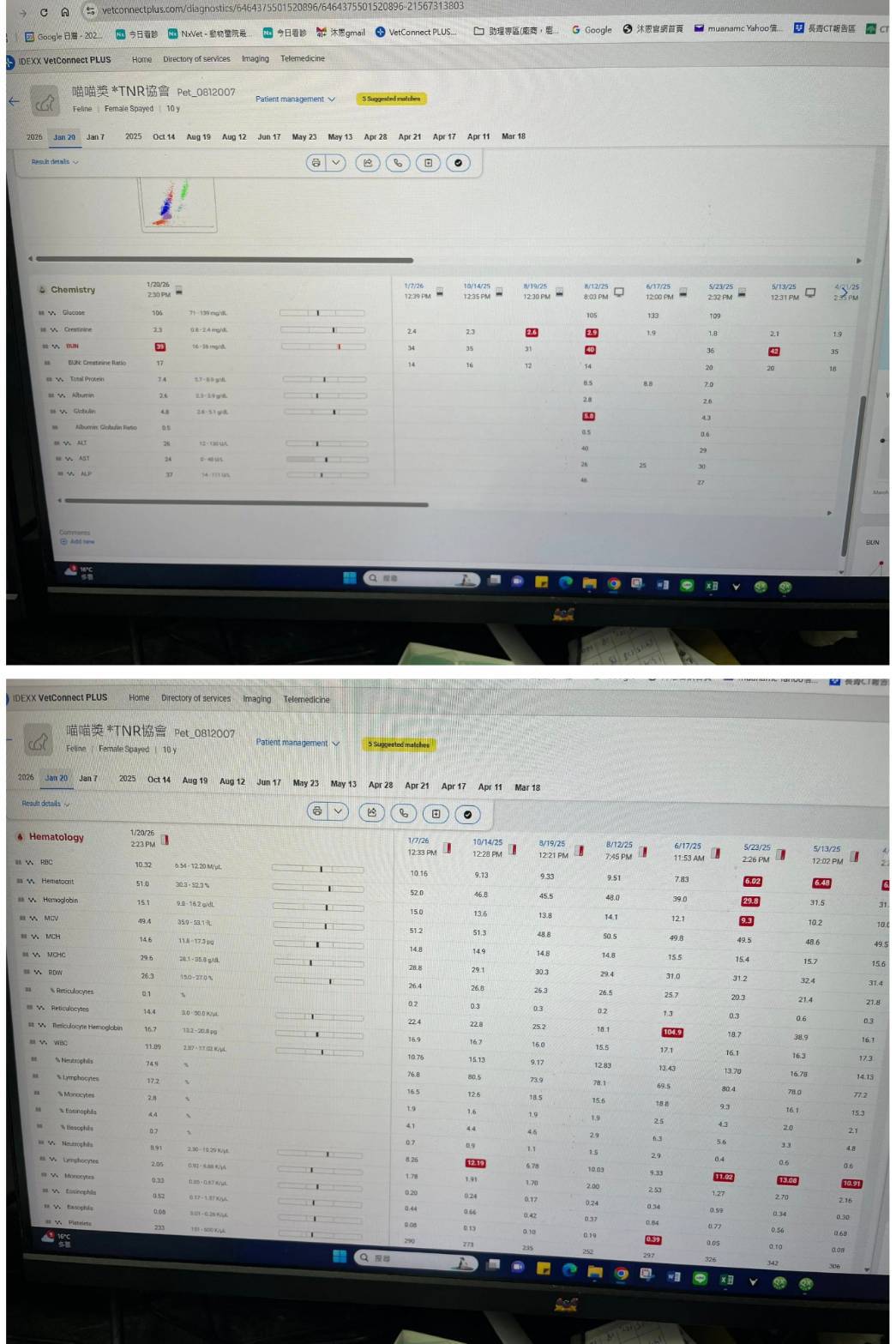 2026年1月7日於沐恩醫院回診,血檢指數都還不錯體重也有維持住,唯一的呼吸道症狀只能持續保養控制,只要不要惡化便可,同時因紅血球指數有回升所以可以暫停施打造血針。狀況若持續良好可3個月後再回診檢查。近期因喵咪醬食慾不振因此於1月20提前回診,所幸血檢結果皆正常,先新增食促藥恢復食慾,若吃得好可再持續服用。