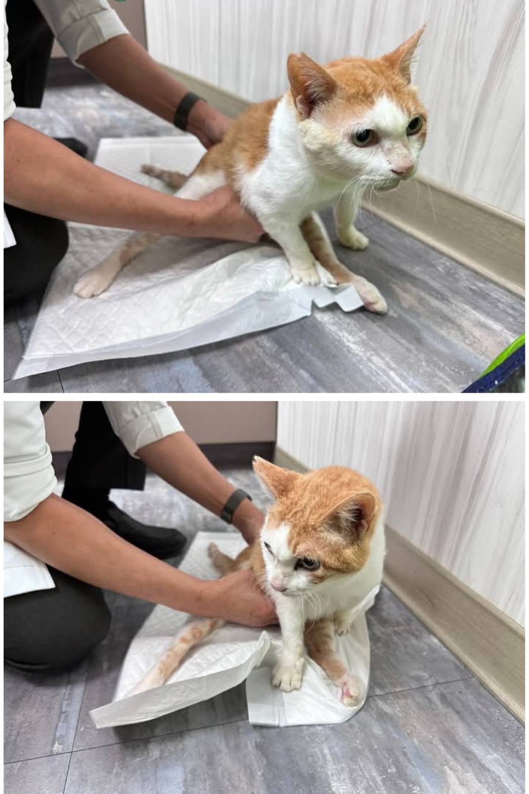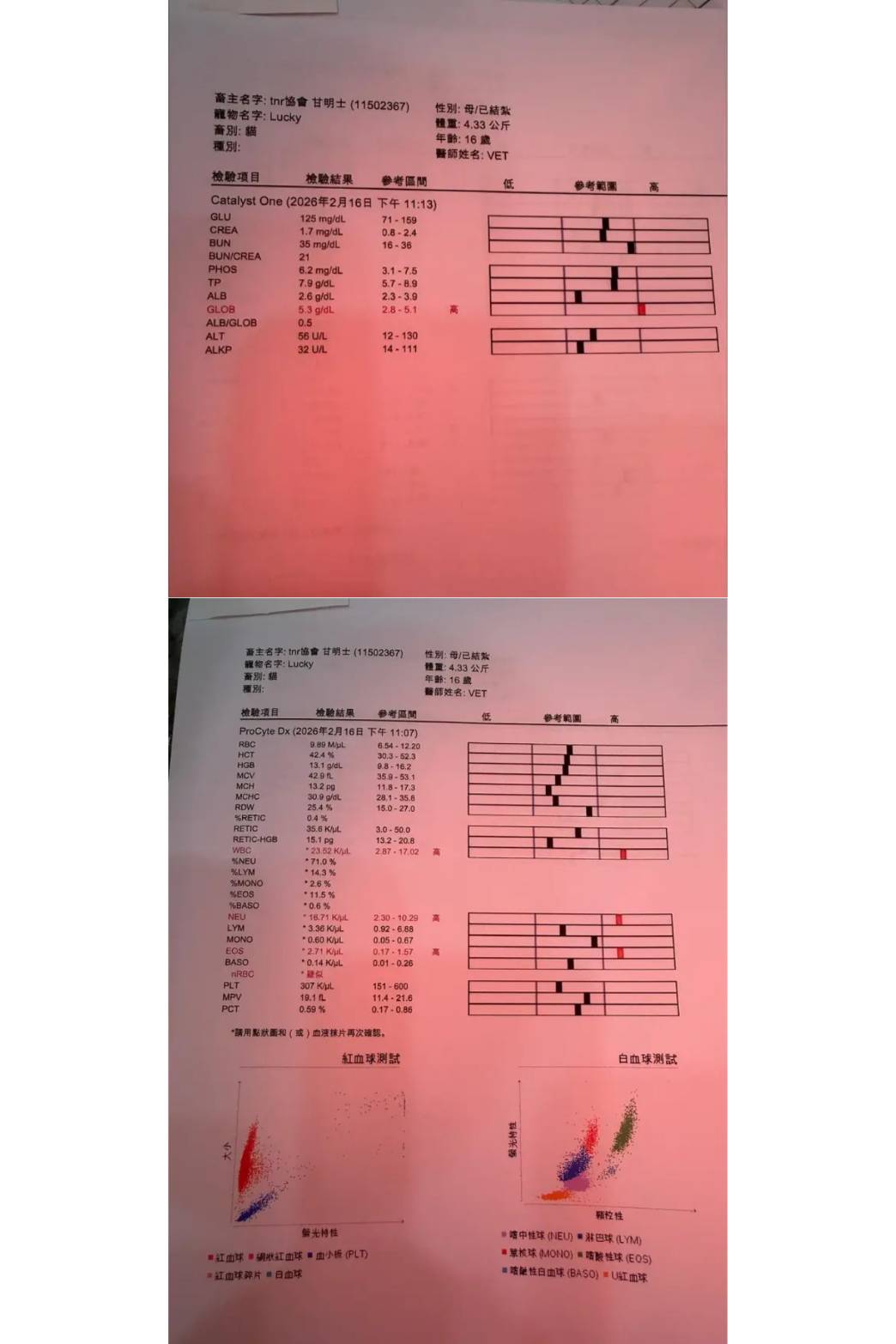 後於2026年2月16日過年期間,因Lucky血尿不止因此緊急於大安動物醫院急診,醫生表示因為外力的因素,也可能因為感染而造成但因為過年期間尿液無法送檢,血檢結果白血球較高,可能是體內的發炎反應,血壓正常、體溫過低需要注意保溫,呼吸較喘,吸氧會比較舒服。加開抗生素跟嗎啡滴劑。超音波顯示膀胱並不會很大,如果自己排尿有很多的話,還是維持原先傍晚跟晚上擠尿即可、或是更少不需特別擠。