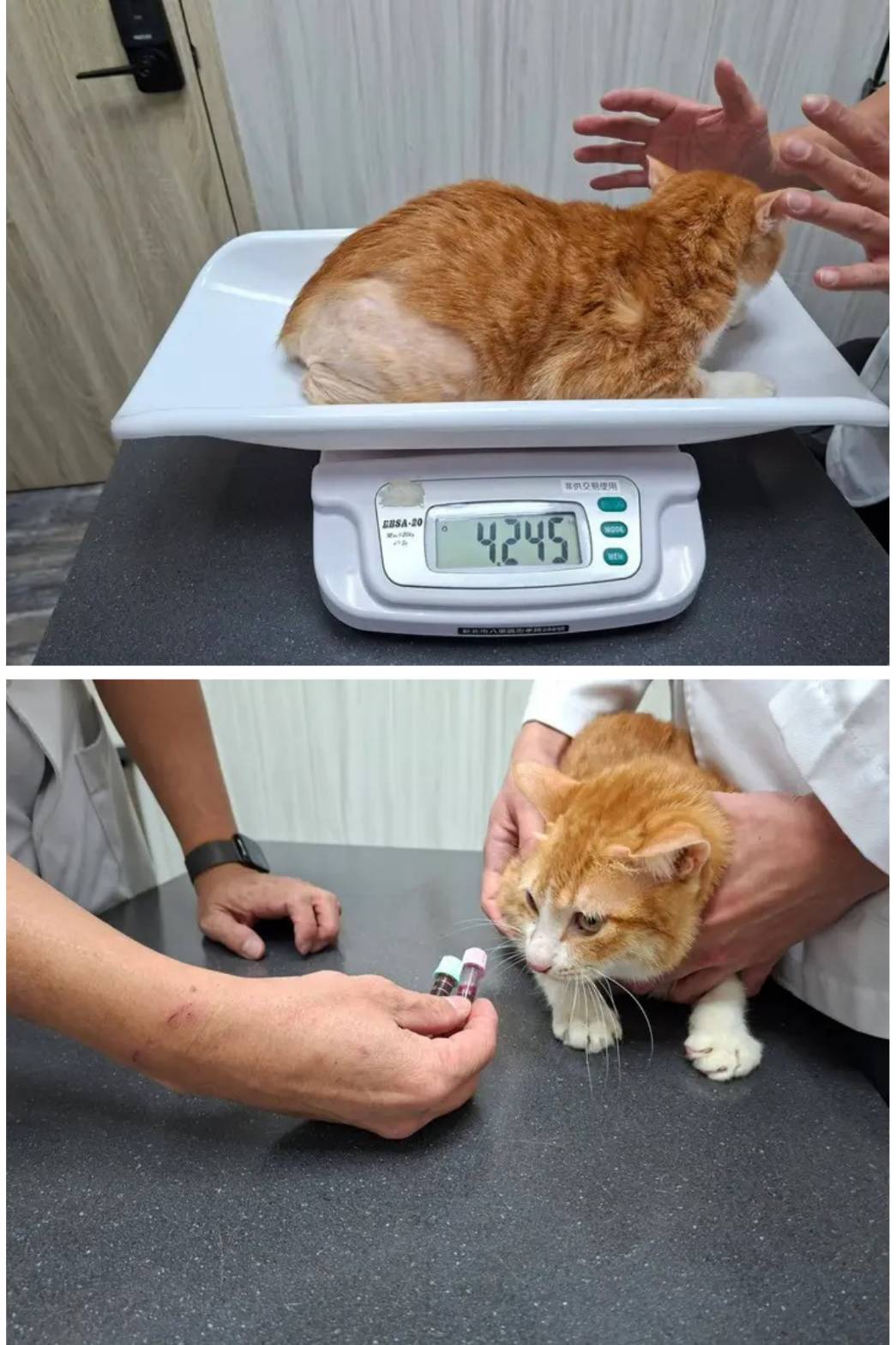 兄妹倆至醫院初診檢查,身上跳蚤很多,上呼吸道問題嚴重,有眼膿、濃鼻涕,血檢結果有貧血還有嚴重的腹瀉拉肚子,看診後住進安養之家隔離照護,兩隻也得分籠以免交叉感染,照護員每天給營養品灌食,兩兄妹越來越放鬆,精神體力也有變好,上呼吸道問題有慢慢改善,但情況還是不夠穩定,3月22日回診,女王因肝指數升高且白血球下降,住院治療時檢測出貓瘟弱陽性,治療一週後,進食有較穩定便辦理出院,因貓瘟有排毒期,為避免傳染、謹慎起見,女王移住單獨隔離區,每天吃藥並持續回診追蹤。