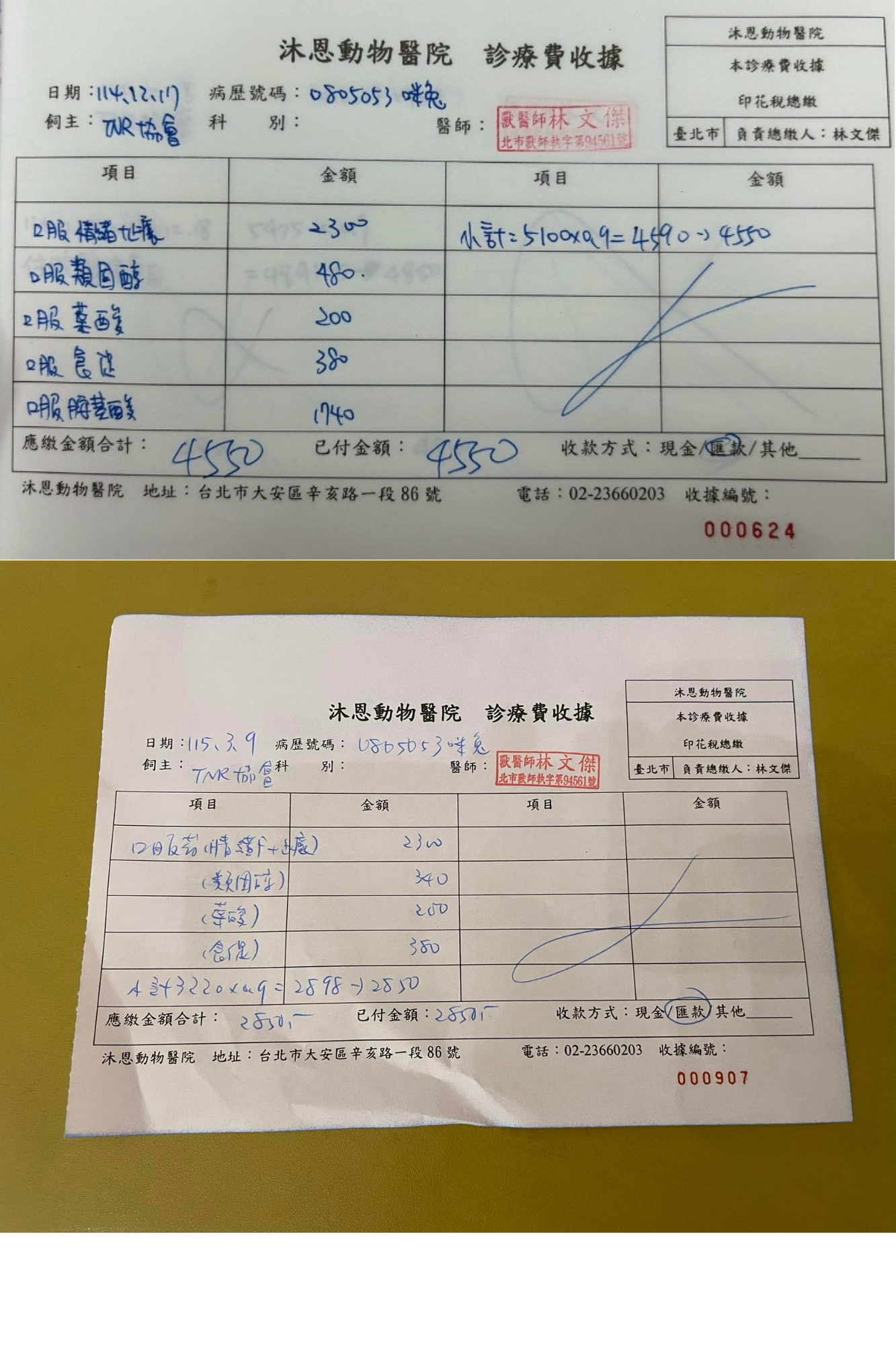 目前咪兔還好食慾精神都還不錯,每週測量體重都維持。咪兔剛來到安養之家時,看到人就躲起來,幸好協會給了他最好的醫療與照護,他與同樣是腹膜炎痊癒的明珠是感情很好的室友,倆隻總是黏在一起、互相理毛,非常溫馨可愛 。本筆醫助是咪兔2025年12月17日一筆於沐恩醫院取藥及2026年2月13日至2026年3月9日於沐恩醫院看診的費用包含血檢及用藥。