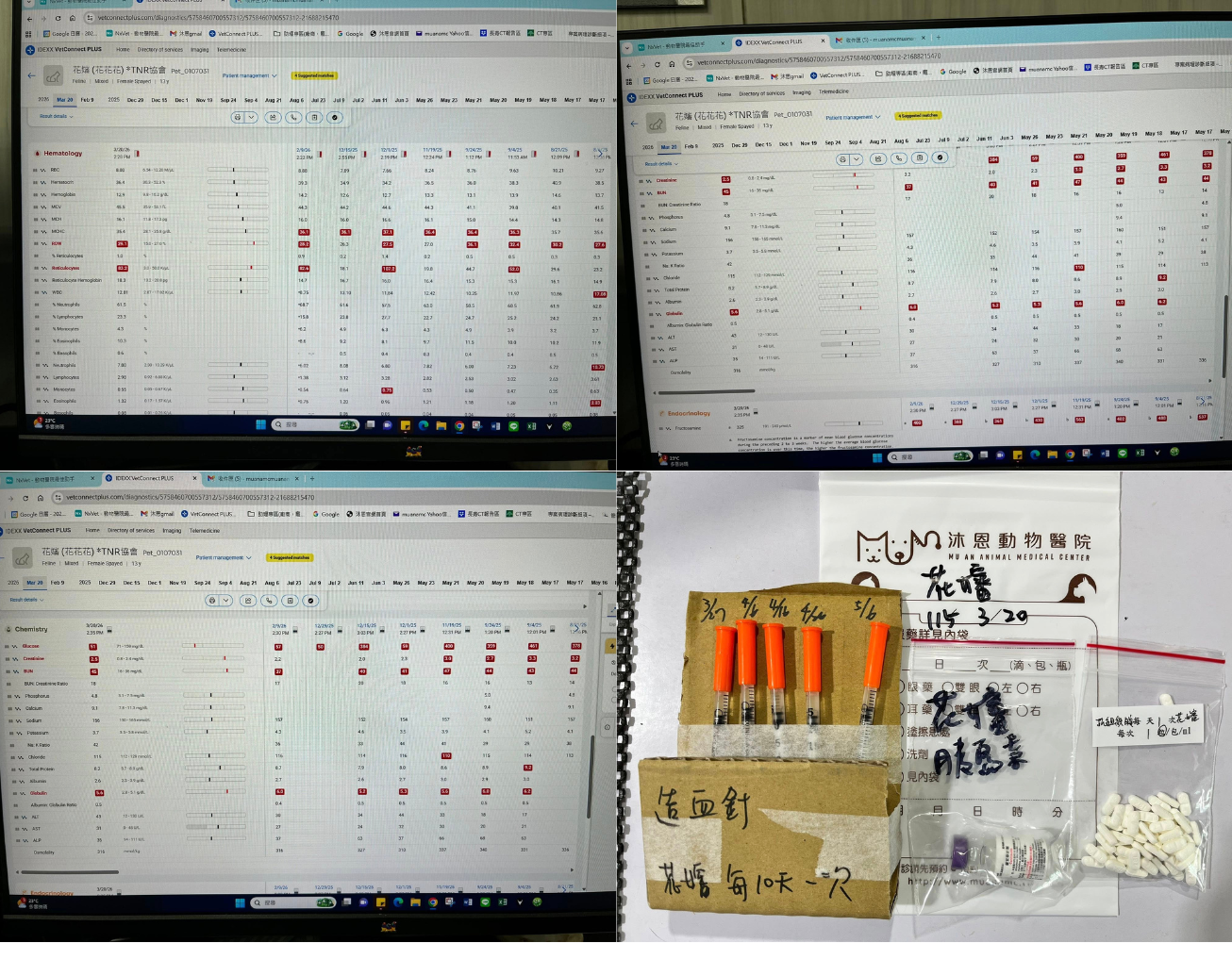 2025年3月25日花嬸突然沒有像往常一樣,拿掉頭套後就想舔,精神不好,頭套裡有嘔吐物,還有蹲便盆但沒有尿便,詢問沐恩後臨時回診,體溫稍微高一點,血檢結果沒有胰臟炎,但白血球升高了,X光檢查胸腹腔沒有發現異常,抽尿檢驗沒有發現細菌的感染情形,就先以腸胃炎治療,打皮下輸液及制酸止吐針劑,看診回到安養之家後,花嬸可能打過針有較為舒服些,有立刻吃飯,也沒有再嘔吐或異常的蹲砂盆行為,2025年4月2日回診追蹤,白血球已經降到正常值了,體重有維持,表示腸胃炎的問題有得到改善,只是血糖升高較多,需要多留意有無異常的多渴多尿。