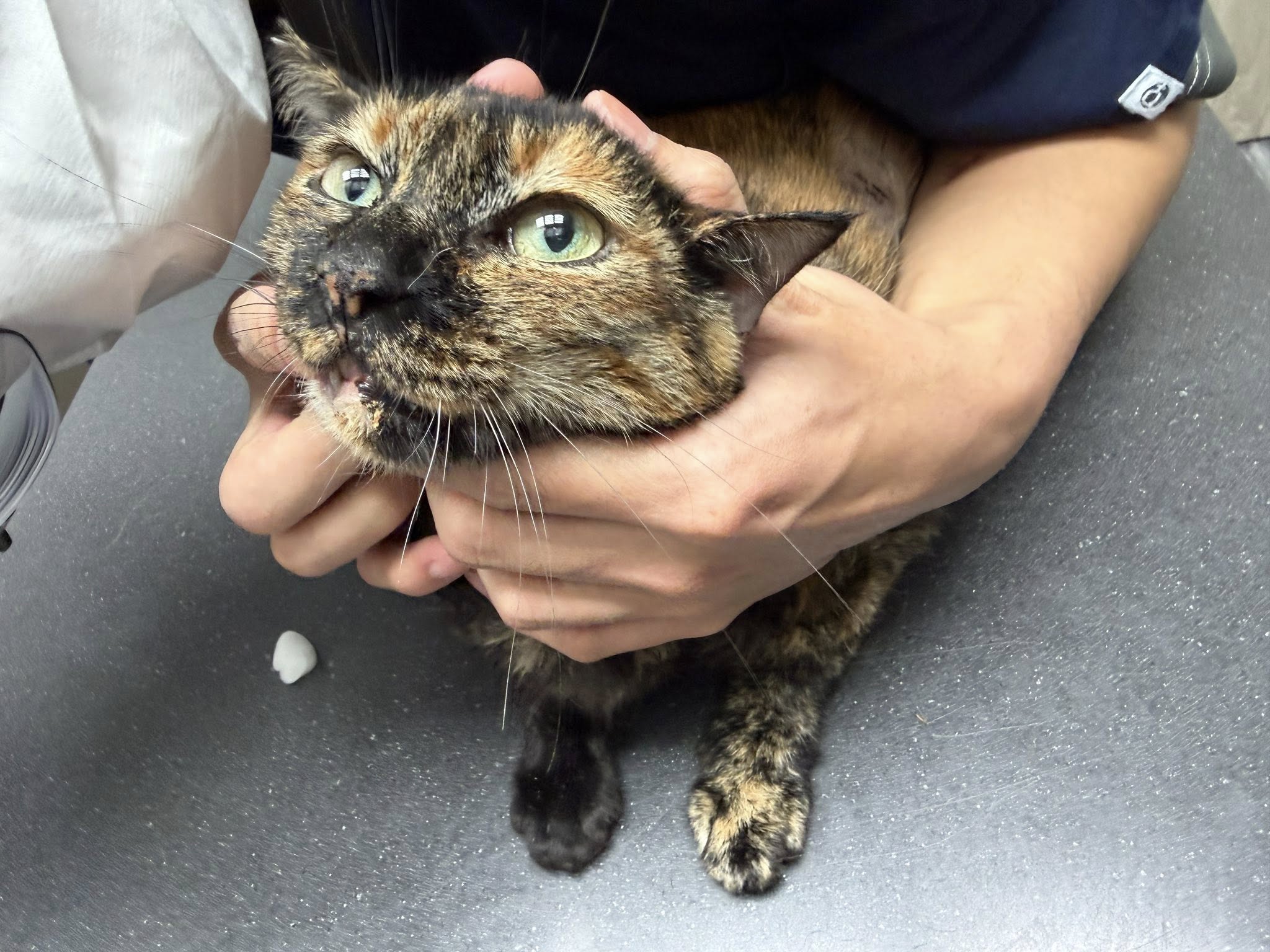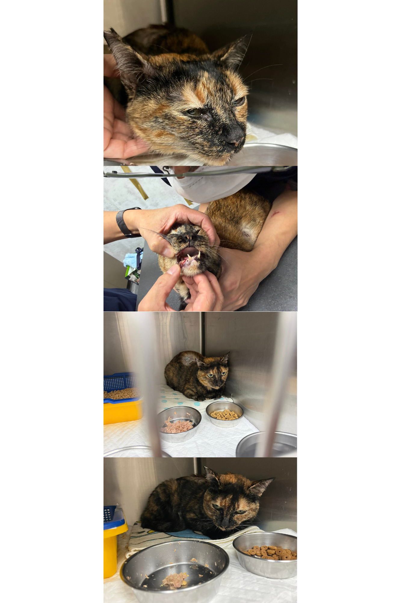 近期3月22日因妹妹至高處跳落,不慎撞到下巴,這兩天比較少走動,24日下午摸到肚子有一塊凸起,因此安排3月24日就醫檢查。到醫院時,腹部的腫脹已經消掉,醫生認為應該是皮下點滴的關係。血檢結果血糖及肝指數皆比上次好,X光顯示腹部有脹氣,可能因為不太動也容易造成脹氣,整體來說無異常。比較特別的地方是右邊邊的犬齒斷掉,因為沒有以前的照片,不確定是跳落造成還是舊傷。先開立少許GABA止痛藥再觀察這兩天的食欲及精神狀況。後續會再安排3月30日進行牙周手術。2026年3月30日進行牙周手術,因右上犬齒斷裂而導致精神食慾下降,今日接受完整口腔檢查及治療,除了右上犬齒外,也一併處理齒吸收病灶的臼齒,一共拔了10顆牙齒,並於當日晚間順利出院回協會照護。