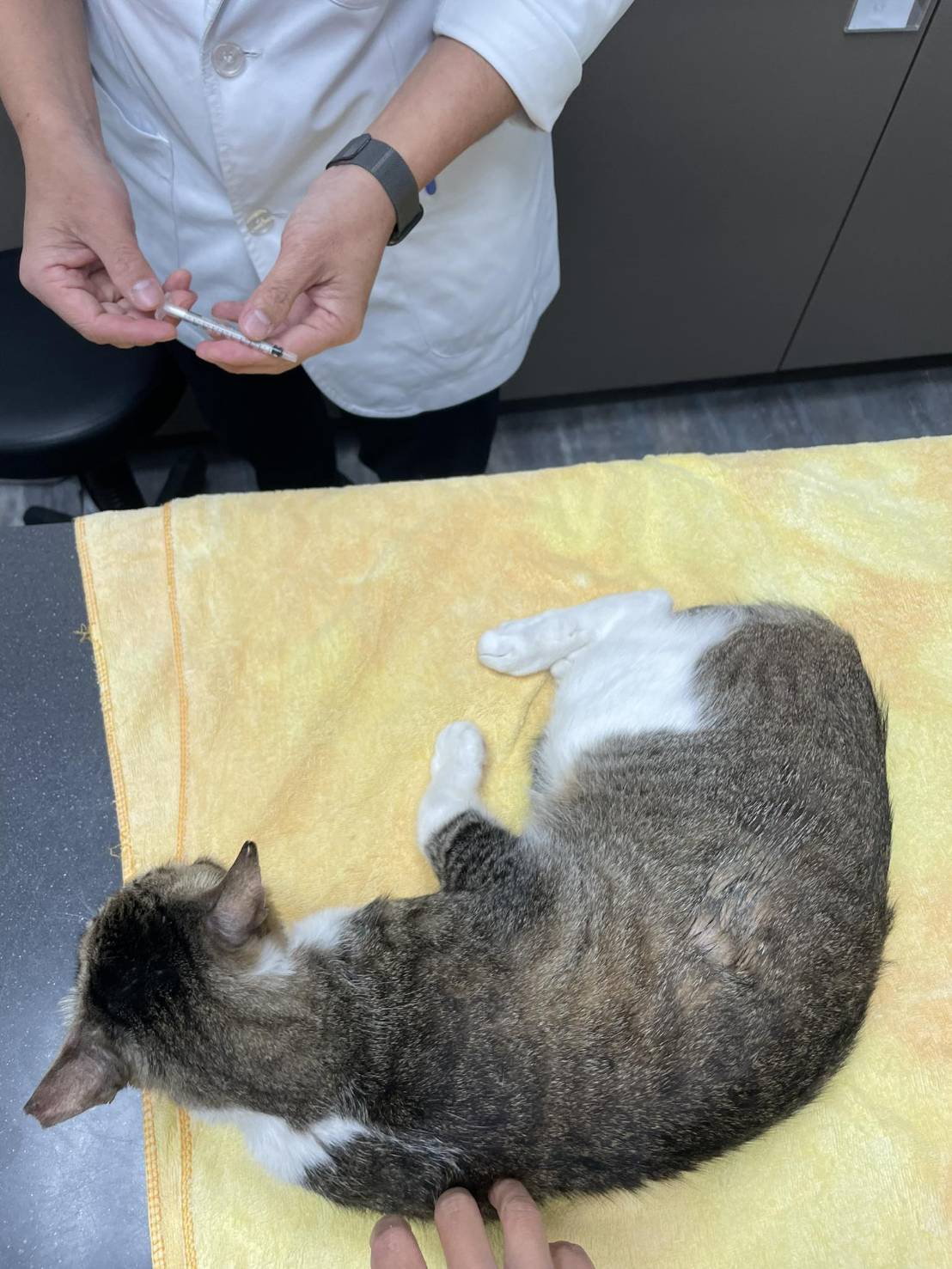 貓咪病情複雜,醫生們懷疑是腫瘤問題,於是7月初寫信向協會尋求幫助,目前已於合作醫院長青進行各項檢測,並於楊動物醫院住院照護中。經檢測,無腫瘤活躍細胞,細菌培養亦無細菌感染,已再進一步另做細菌切片染色檢測。第一階段報告結果,醫師認為,下巴跟頸部後側莫名腫大的原因,跟貓愛滋發病有關。目前投以抗生素、造血針治療中。