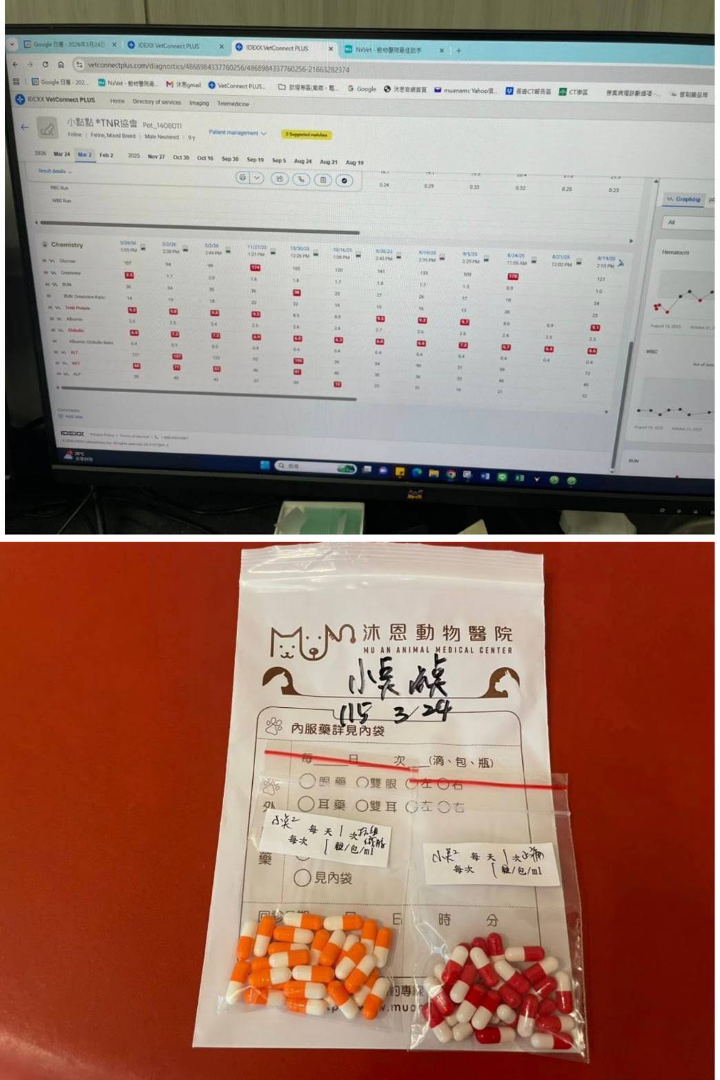2026年2月2日於沐恩回診,此次血檢無特別須注意指數,但聽診時發現有些心雜音但醫師表示並不嚴重,因此可持續觀察,牙齦兩側還是有紅,下巴比之前腫一些。但白血球裡面的淋巴球太活躍,綜合上述檢查結果,在今天需施打高劑量干擾素。後再於3月2日回診,這次下巴淋巴結偏腫,需要持續觀察右邊嘴角有沒有變嚴重,以及下唇是否有更腫,觸診沒發現異常,聽診沒發現異常但肝指數稍高,其他指數都持平。2026年3月24日於沐恩回診,此次施打高劑量干擾素,血檢結果顯示腎指數升高須改吃腎處方飼料,因紅腫狀況已逐漸好轉先將止痛改為低劑量並持續觀察,於一個月後再回診。本筆醫助為2026年3月24日於沐恩醫院的費用,包含看診血檢及各項用藥。