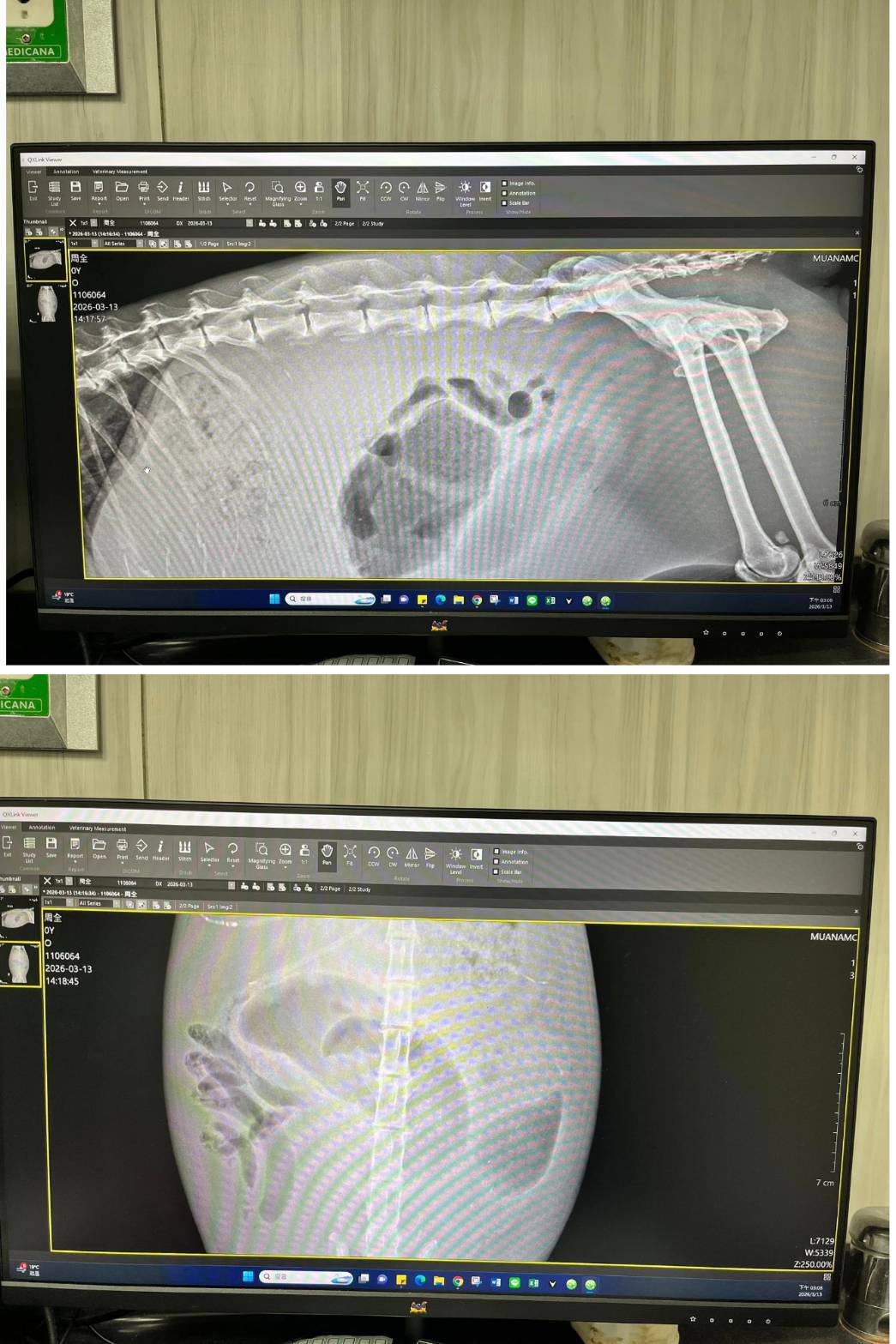 2025年6月13日周全早上反常沒有將食物吃完、嘔吐、精神不好,回報沐恩後臨時回診。血檢胰臟炎是陰性,但超音波影像胰臟炎是偏白,醫師懷疑還是有胰臟炎,少量腹水也是因身體發炎引起,也擔心即將有全身性的細菌感染,今天用藥會做調整。