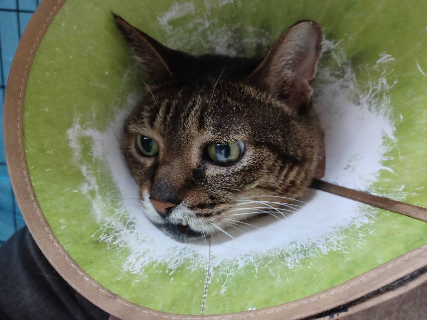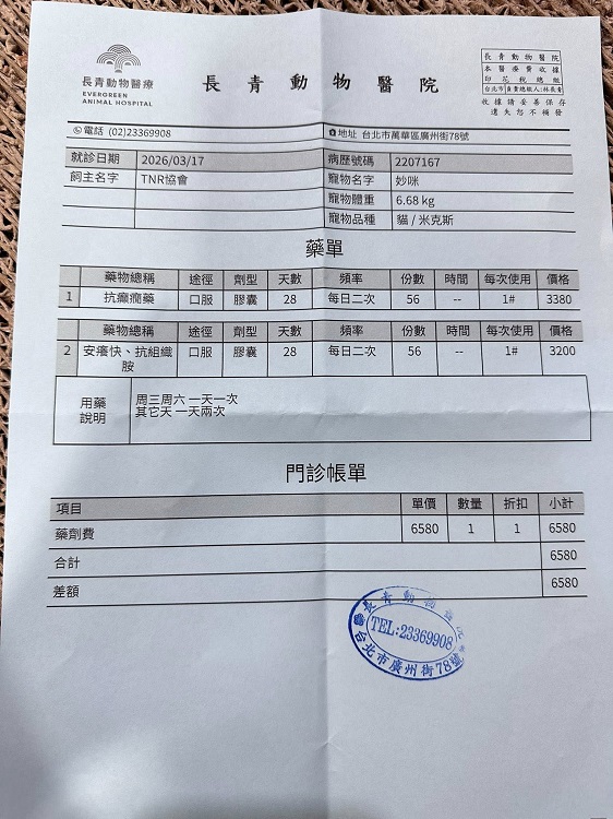 目前妙咪皮膚狀況維持得不錯,因擔心舔毛會誘發癲癇,所以仍須穿著防護衣及戴頭套,治療至今,癲癇發作次數及時間有明顯減少很多,但妙咪的癲癇仍可能會是需要終身吃藥;可憐的妙咪因被壞人傷害造成皮膚相當敏脆弱,並因此造成發作癲癇,還好有協會的救援與安置,讓妙咪能夠有機會接受最好的醫療與照護,妙咪的醫療用藥是終身需求,本筆醫助是自2026年3月7日間至長青醫院取癲癇、止癢用藥的費用。