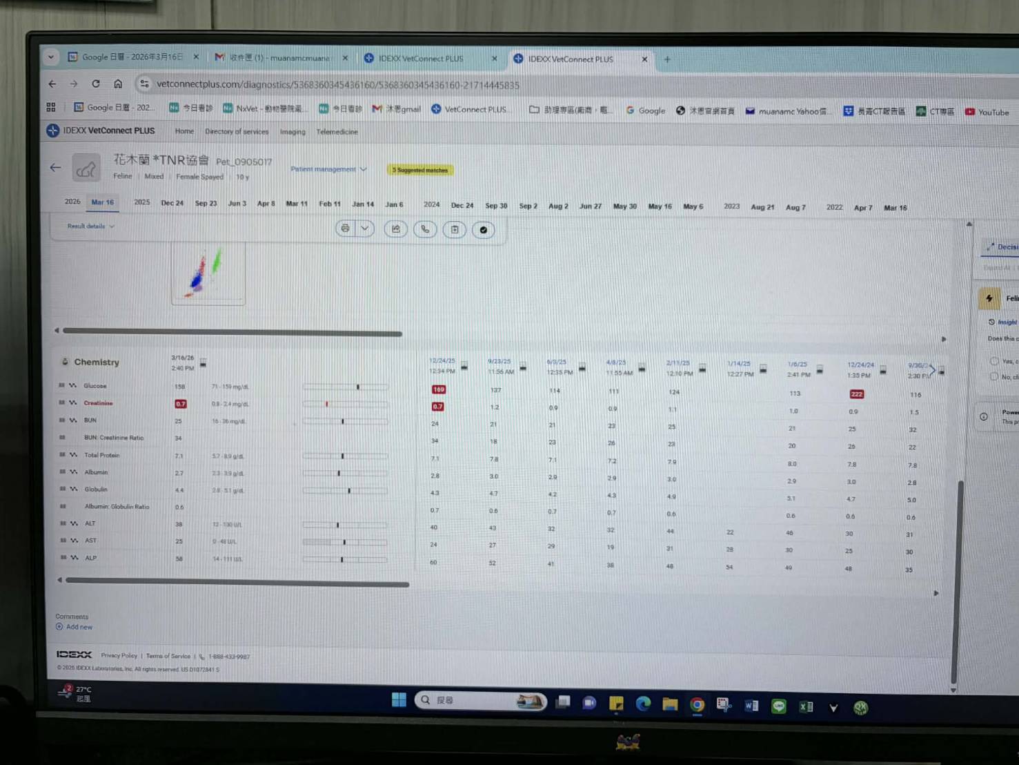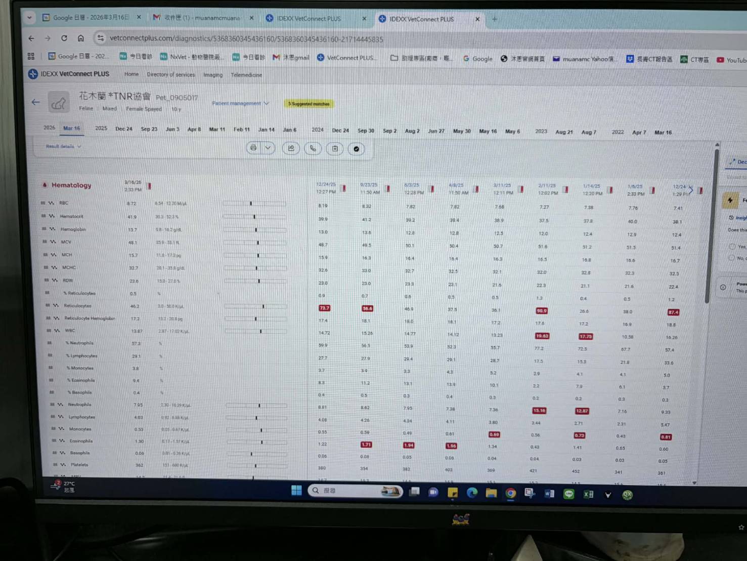 2025年12月24日於沐恩回診,血檢顯示血糖稍高,可能是等看診太久影響但其他指數皆正常。長期的呼吸道問題無改善,醫師建議洗鼻,但鼻涕打不太出來,醫師懷疑裡頭有增生,但需要照斷層掃描才能確定,這兩種方法都需要麻醉,考量花木蘭年紀大,所以暫時不考慮。2026年2月9日持續用藥治療。2026年3月16日於沐恩醫院定期回診,此次體重有稍微減輕,先繼續觀察再考量下次回診時是否添增食慾促進劑,血檢指數皆正常,沒有需要特別注意的異常指數。