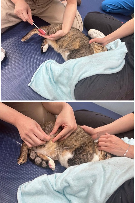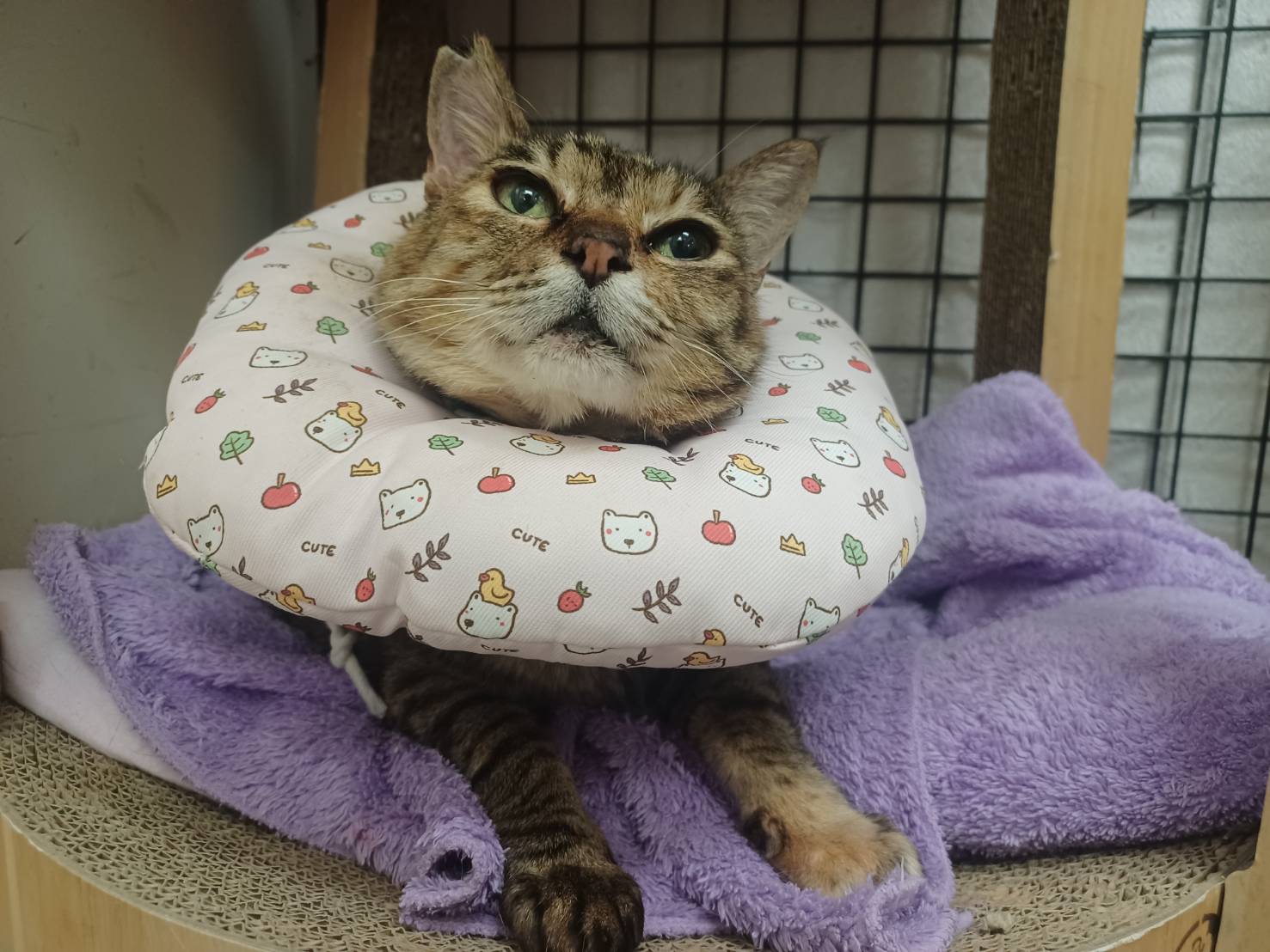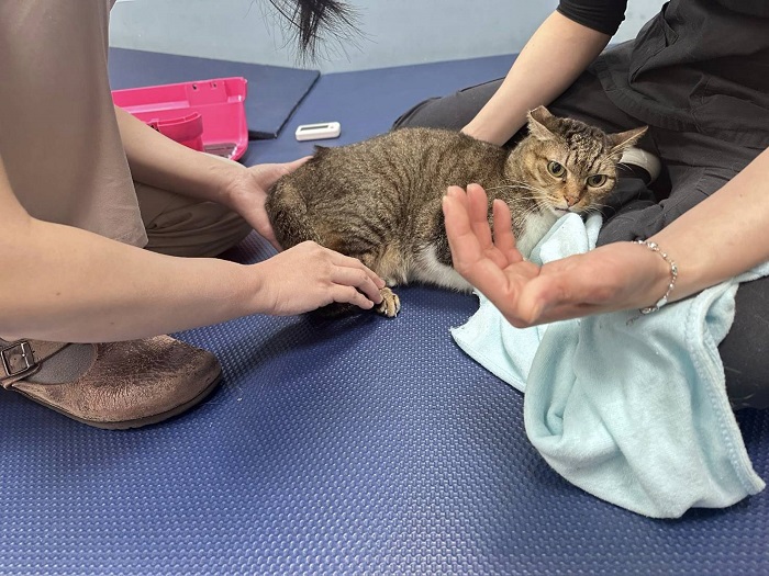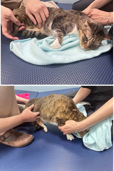 住院至2024年6月11日,羅賓已可自己吃足夠的飯,不須再裝餵食管,也能前手支撐自行移動爬至貓砂盆大小便,右後腳背處傷口已癒合,也不需再清潔換包紮,當天辦理出院接回安養之家照顧。