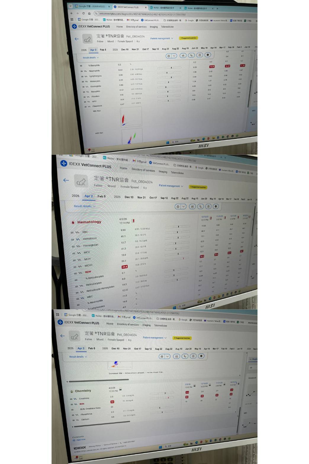 於2025年11月21日回診,因被持續有黴菌感染還是要戴頭套並且每日清洗患部,血檢部份,腎指數下降至正常範圍內,醫師表示就按照目前照護方式食物盡量不要變,盡量腎處方。再於12月10日於沐恩回診,背上黴菌已恢復良好,持續用蚤梳梳毛清潔即可,腎指數下降至正常範圍內就按照目前照護方式持續用藥。2026年2月5日於沐恩回診,皮膚有發現新患處但尚不嚴重持續梳毛保持乾燥即可,各指數皆持平因此用藥不變,唯有看診時呼吸聲大平日需做氣霧保養。目前定著每日皆做氣霧保養後,呼吸鼻塞問題已有日漸改善。