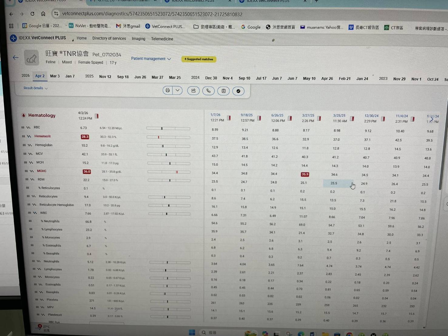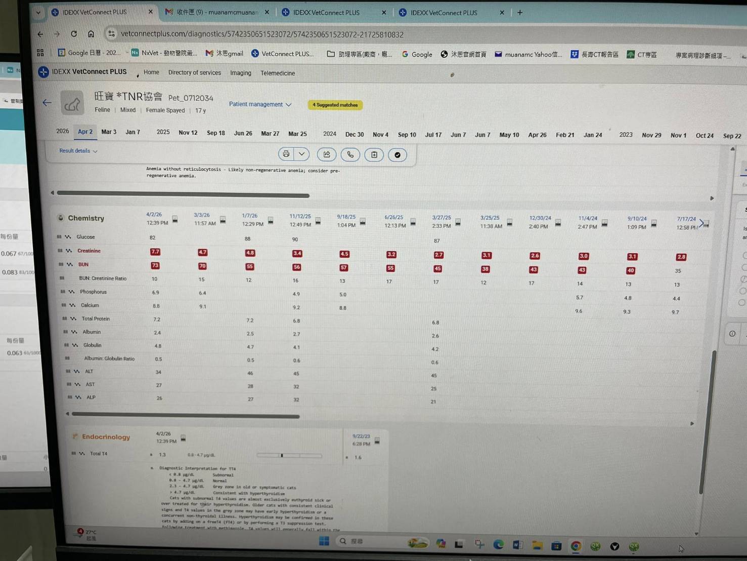 2026年4月2日於沐恩看診,血檢結果腎指數非常不好腎功能狀況應該不是很理想,高非常多惡化很快體重下降很多。建議換成固定腎處方飼料。腸寶建議改VSL#3,避免給予高磷食物,能單獨給予食物觀察食量為佳。