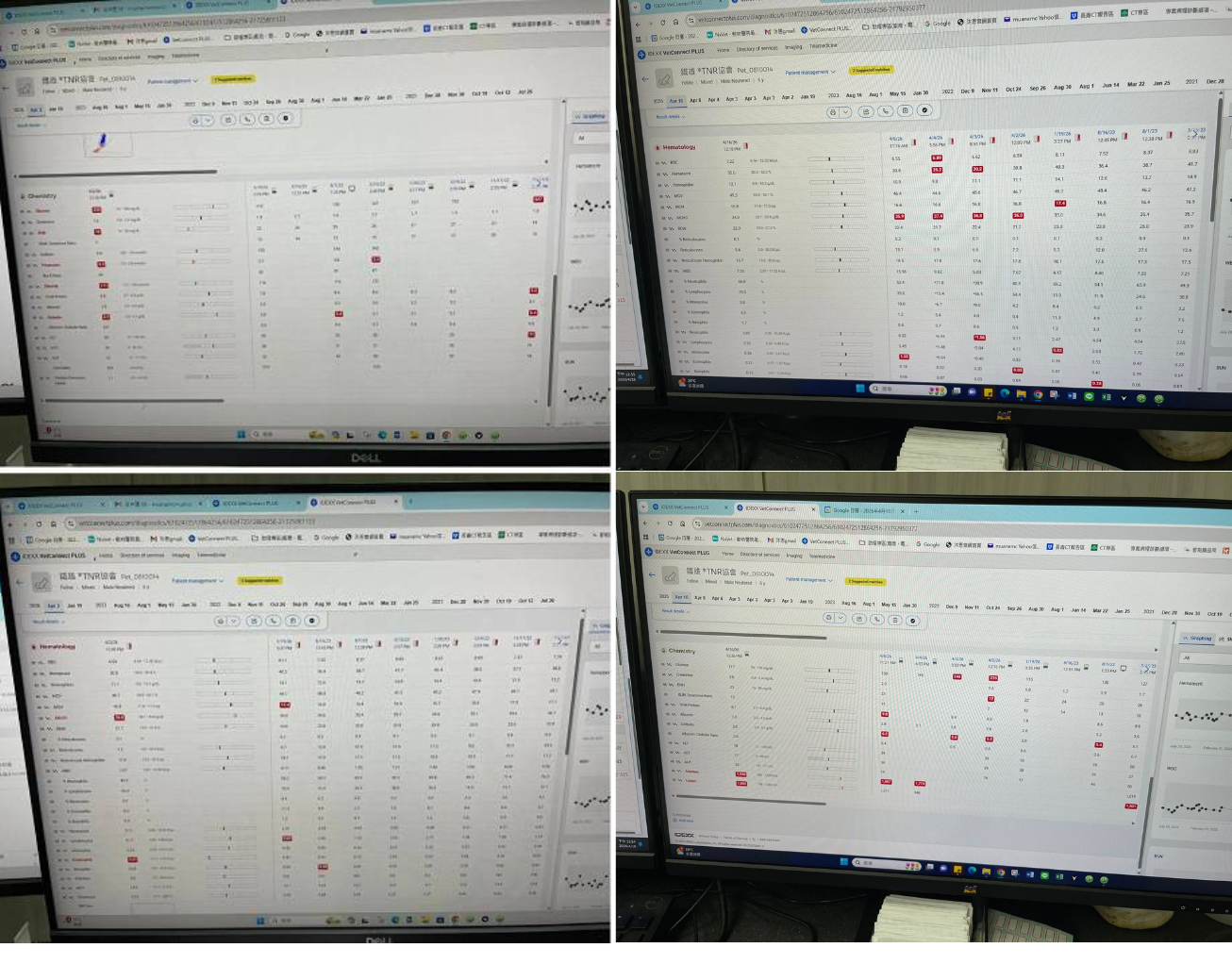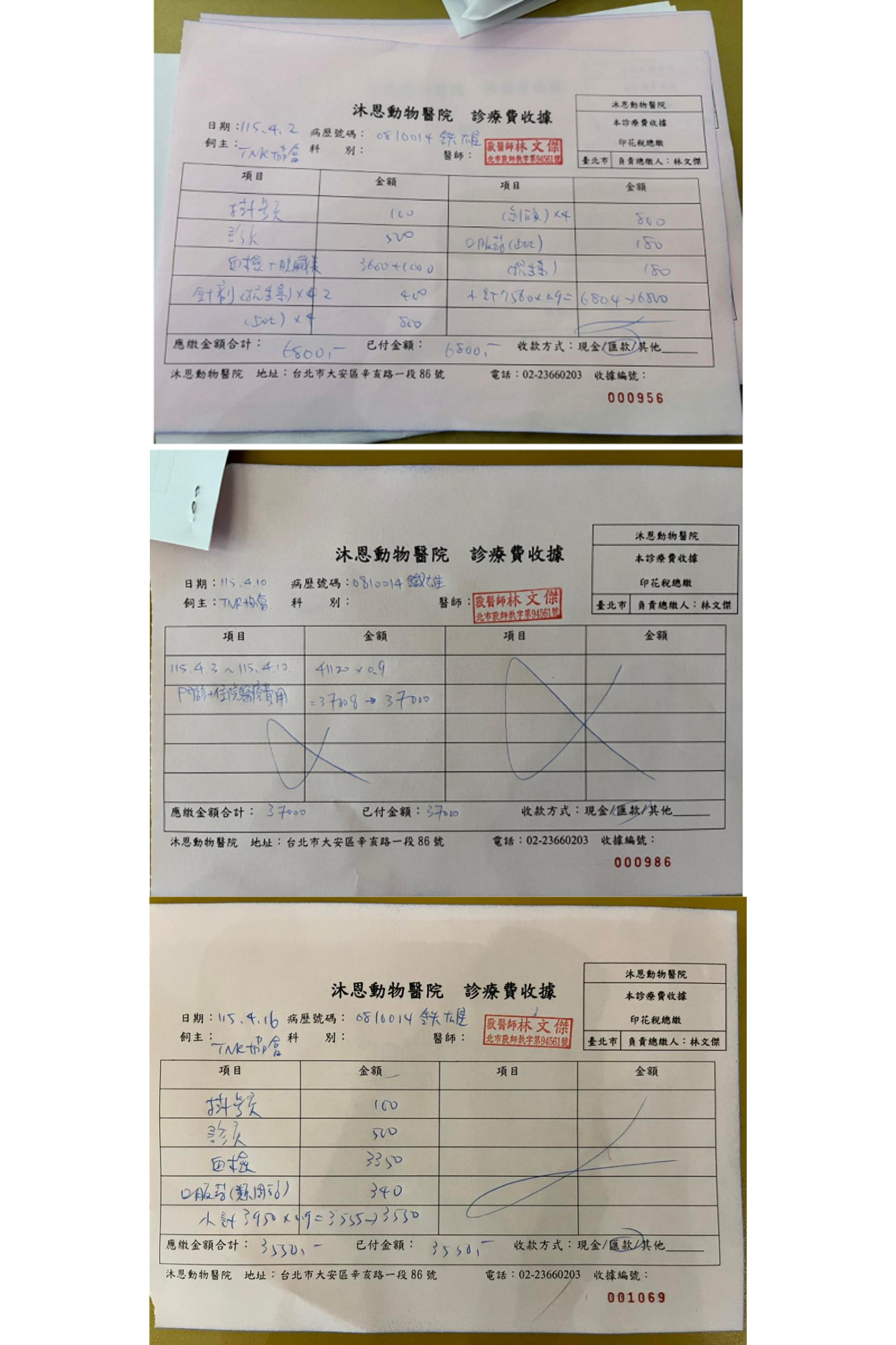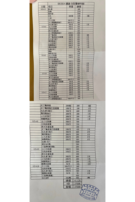 2026年4月發現鐵雄連續兩日未自主進食且精神萎靡,於4月2日至沐恩看診,檢查發現體溫高達40度已發燒且因脫水血糖偏高,血檢結果無其他偏高症狀,先行開立止吐抗生素等藥物治療,並須注意如進食未達標準量10克以上則需灌食。目前因鐵雄持續狀況不佳已安排於4月3日沐恩醫院住院觀測治療。住院至4月7日間持續進行靜脈點滴注射、預計4月8日可以停止靜脈注射點滴改為皮下點滴,再觀察整體精神跟身體狀況。並於4月8日同天確認鐵雄為胰臟炎。在經過兩日住院觀察治療後鐵雄已可自主進食且食慾皆正常、各項指數已平穩,於是安排2026年4月10日出院回協會繼續觀察照護。4月16日再次回診,胰臟指數還是偏大,掃超音波看一下胰臟目前沒有明顯腫大。因此先繼續觀察用藥,兩周後再回診。本筆醫助是2026年4月2日至2026年4月16日間於沐恩醫院的費用,包含看診、住院、靜脈點滴注射、血檢及用藥。