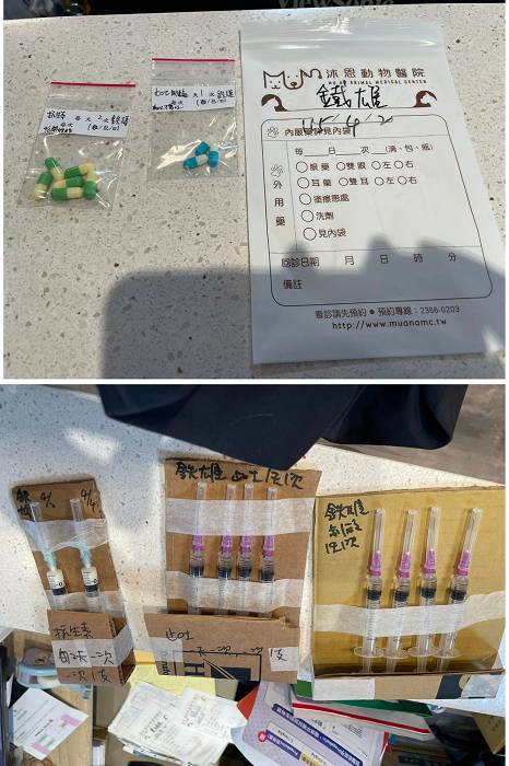 1.抗生素T:每天2次,每次8ml,早晚皮下施打。(4/11晚上打完停)需避光冷藏。