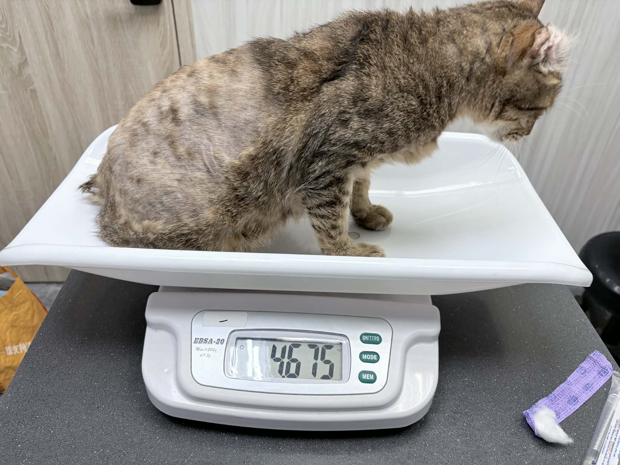 數例為愛滋及血巴東,所以再送驗血巴東檢查,幸好收到報告後血巴東是陰性,因此研判貧血原因可能是跳蚤太多及營養不良,住院期間又發現有毛囊蟲,打針及吃藥至狀況穩定做了耳血腫治療的手術,住院近一個月時間、狀況較為穩定,辦理出院接回安養之家,在內科方面治療至較為穩定、為了改善口炎情況,於2022年3月22日進行牙周手術全口拔牙。