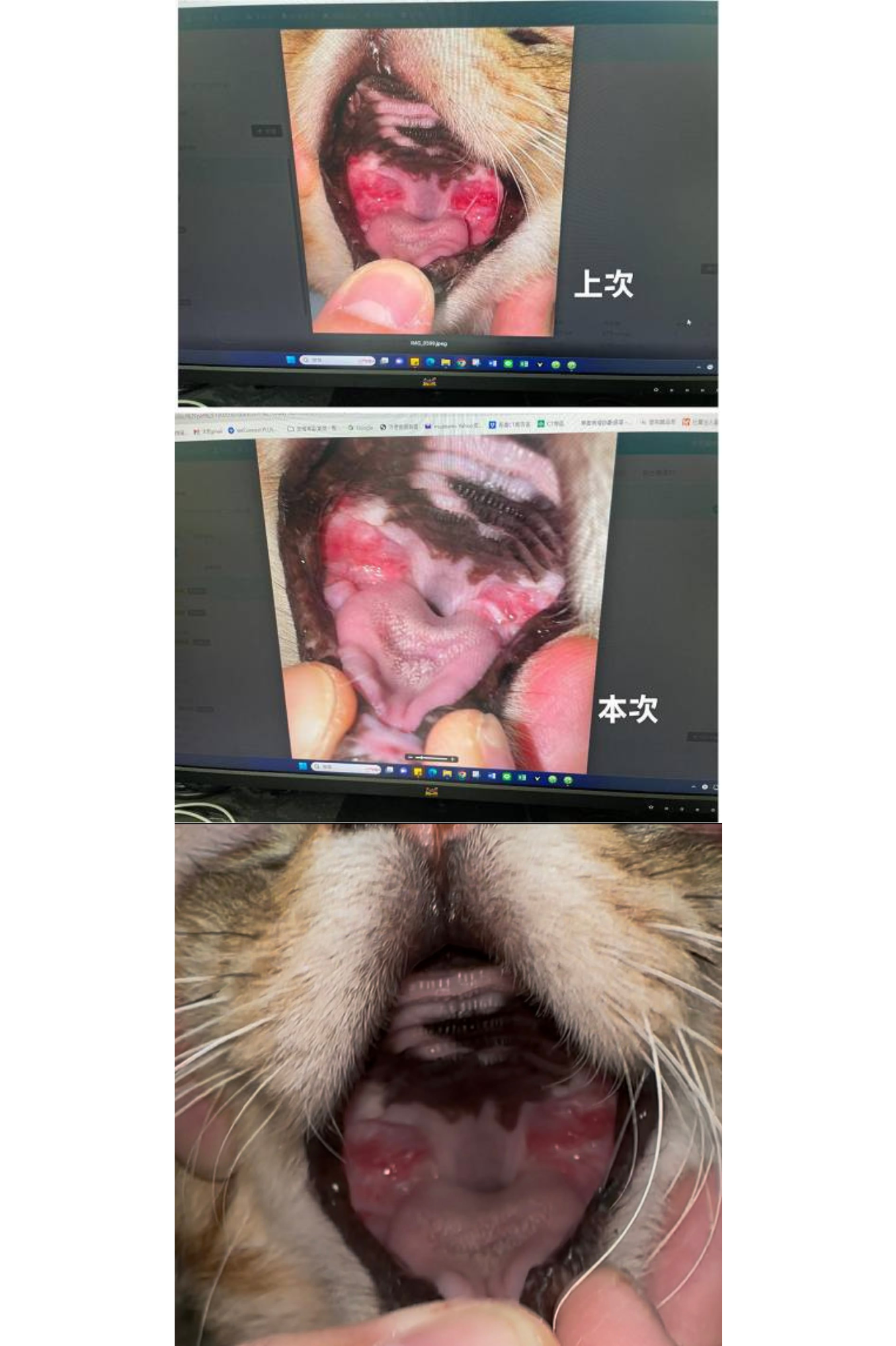 2025年4月8日,皮膚有改善,整體血檢都還良好,肝指數正常、沒有因為吃黴菌藥受到影響,口腔檢查結果,雖後方兩側仍有點紅但舌頭表面正常沒有出現潰紅,整體檢查是還穩定,但體重減輕較多,需要留意進食並注意若體重再減輕就要提前回診。