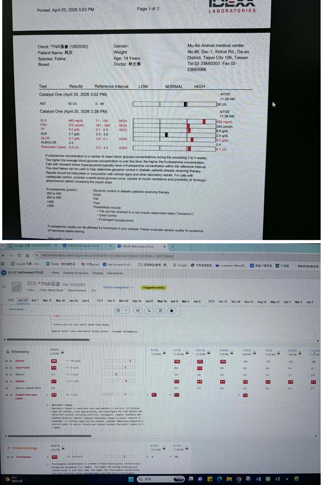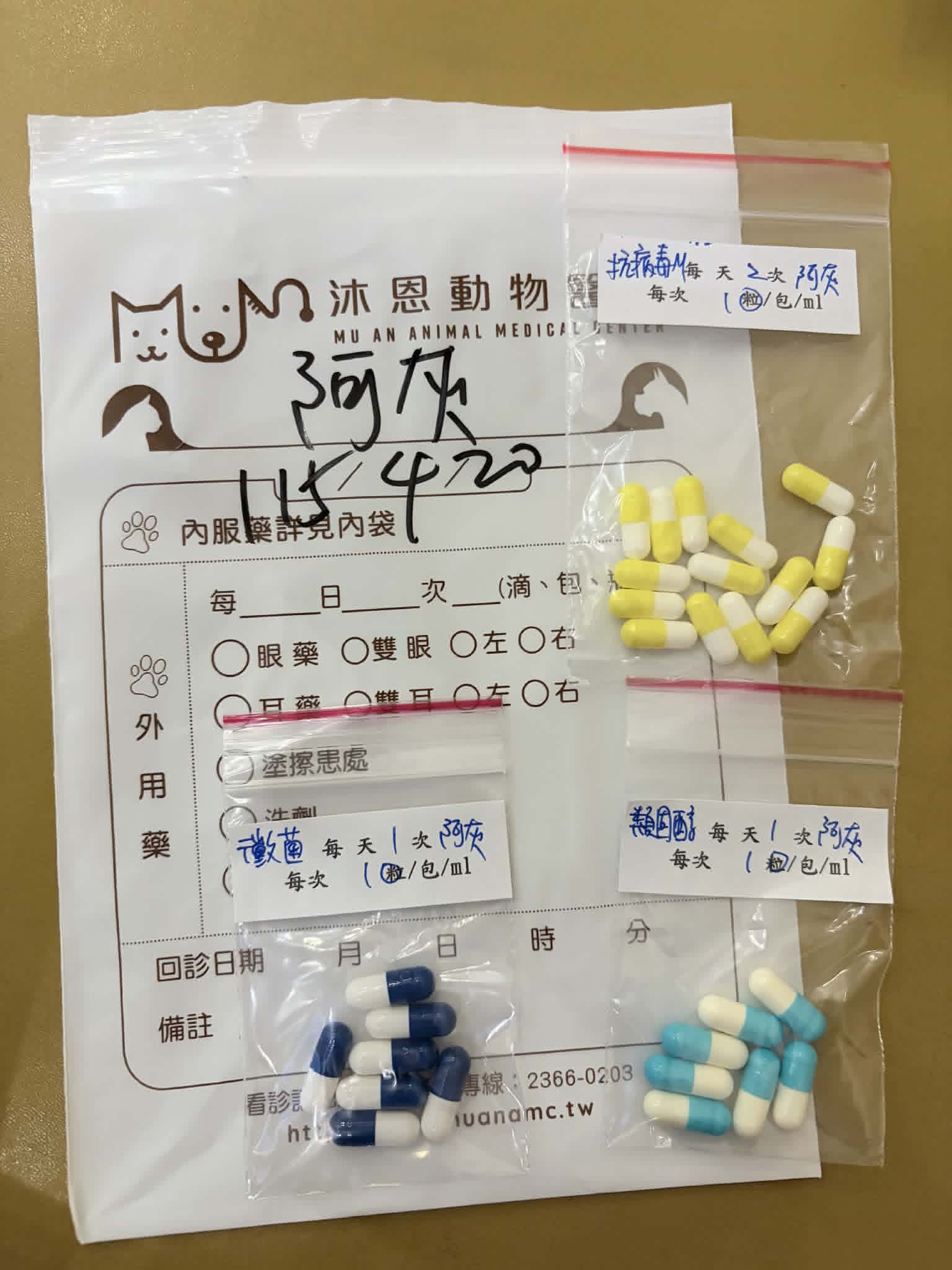 2026年4月7日於沐恩回診,口腔檢查嘴內兩側狀況好很多有明顯改善,舌頭已無潰瘍。抗病毒藥減量,因為白血球偏低。皮膚黴菌需繼續吃藥,血檢血糖偏高,要控制飲食,食物單純化不要另外給零食,擔心會是糖尿病徵兆。有拉泥便帶血且黏稠狀,醫師表示有驗出胰臟炎,下次回診要再次確認血糖問題及胰臟指數。2026年4月20日沐恩回診,因最近持續軟泥便且有兩次帶血,用藥部分增加KBT為一天兩次。血檢結果顯示胰臟持續發炎,且有輕微糖尿病,但先不用處理。醫師指示食物給予需單純化禁吃零食。