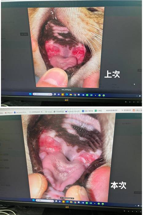 2025年4月8日,皮膚有改善,整體血檢都還良好,肝指數正常、沒有因為吃黴菌藥受到影響,口腔檢查結果,雖後方兩側仍有點紅但舌頭表面正常沒有出現潰紅,整體檢查是還穩定,但體重減輕較多,需要留意進食並注意若體重再減輕就要提前回診。