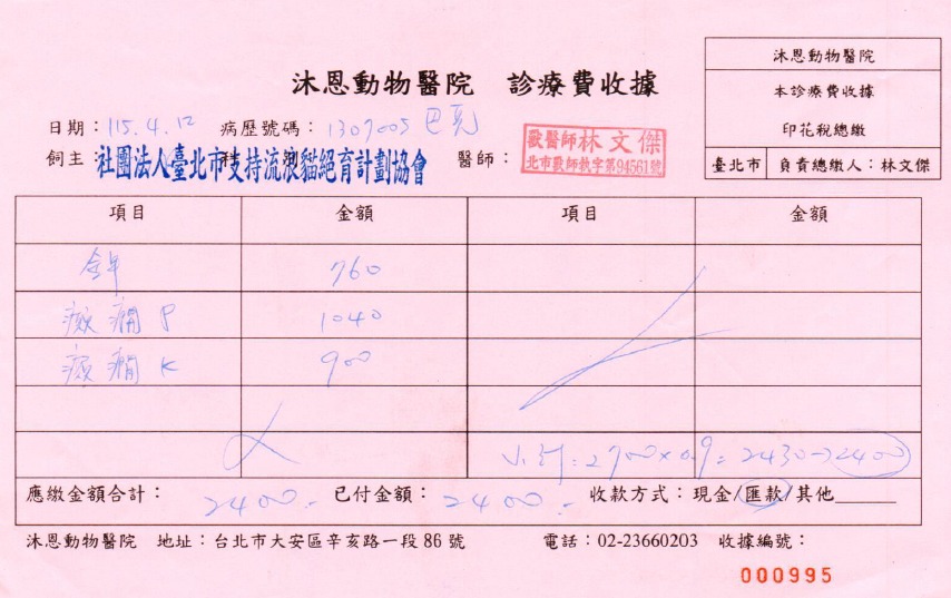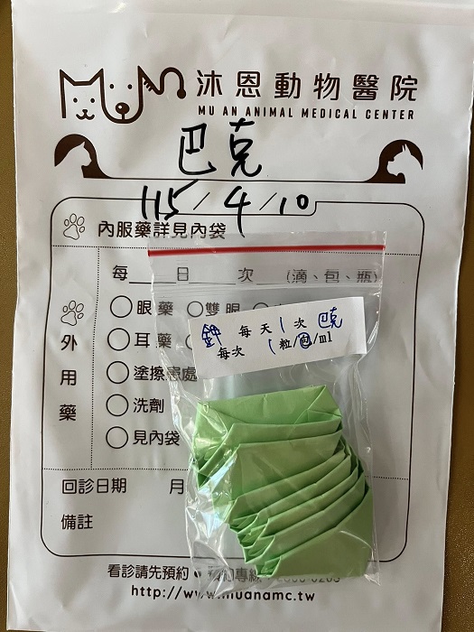 因巴克腦部傷害屬重創,對神經傷害較嚴重,往往有些動作達不到所想要的目的,若藥物濃度不足,就會引發癲癇。目前每日皆需服用兩款抗癲癇藥物,貓咪各項指數正常、但不若一般貓咪可以跑跳運動,故有些胖,目前飲食控制中,每日放風鍛鍊四肢避免身體萎縮。本筆醫助為巴克2026年4月12日於沐恩醫院取藥的費用。