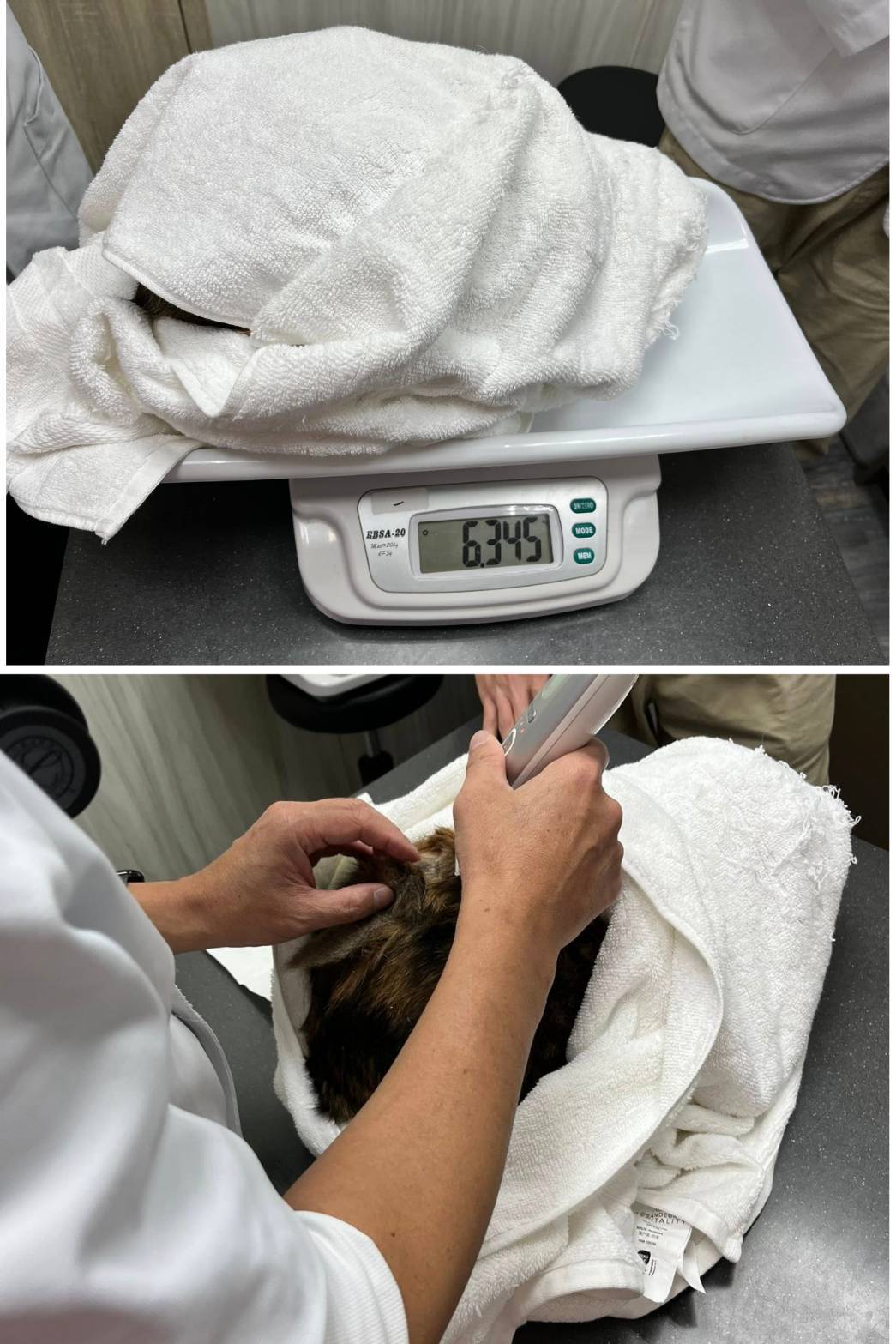 院長幫福咪觸診聽診檢查,去毛球和剪指甲。