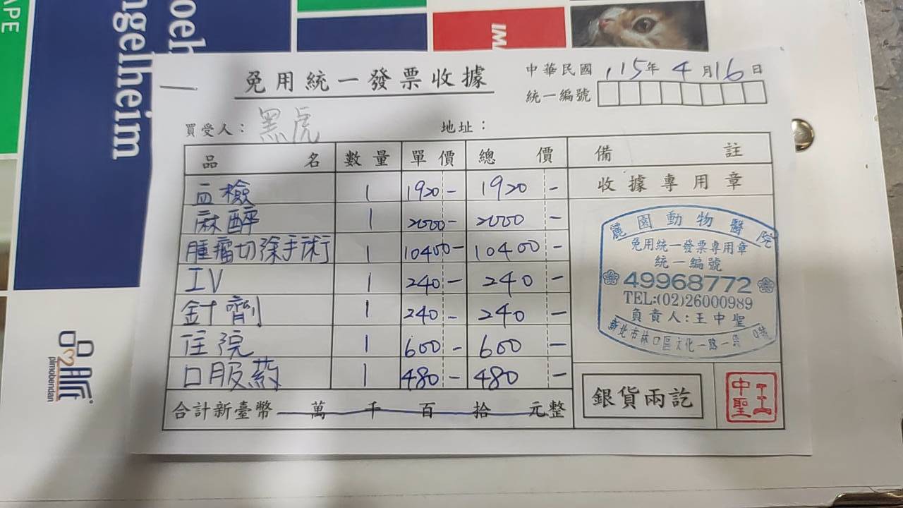 本筆醫助為黑虎2026年4月16日於麗園動物醫院進行手術的費用,