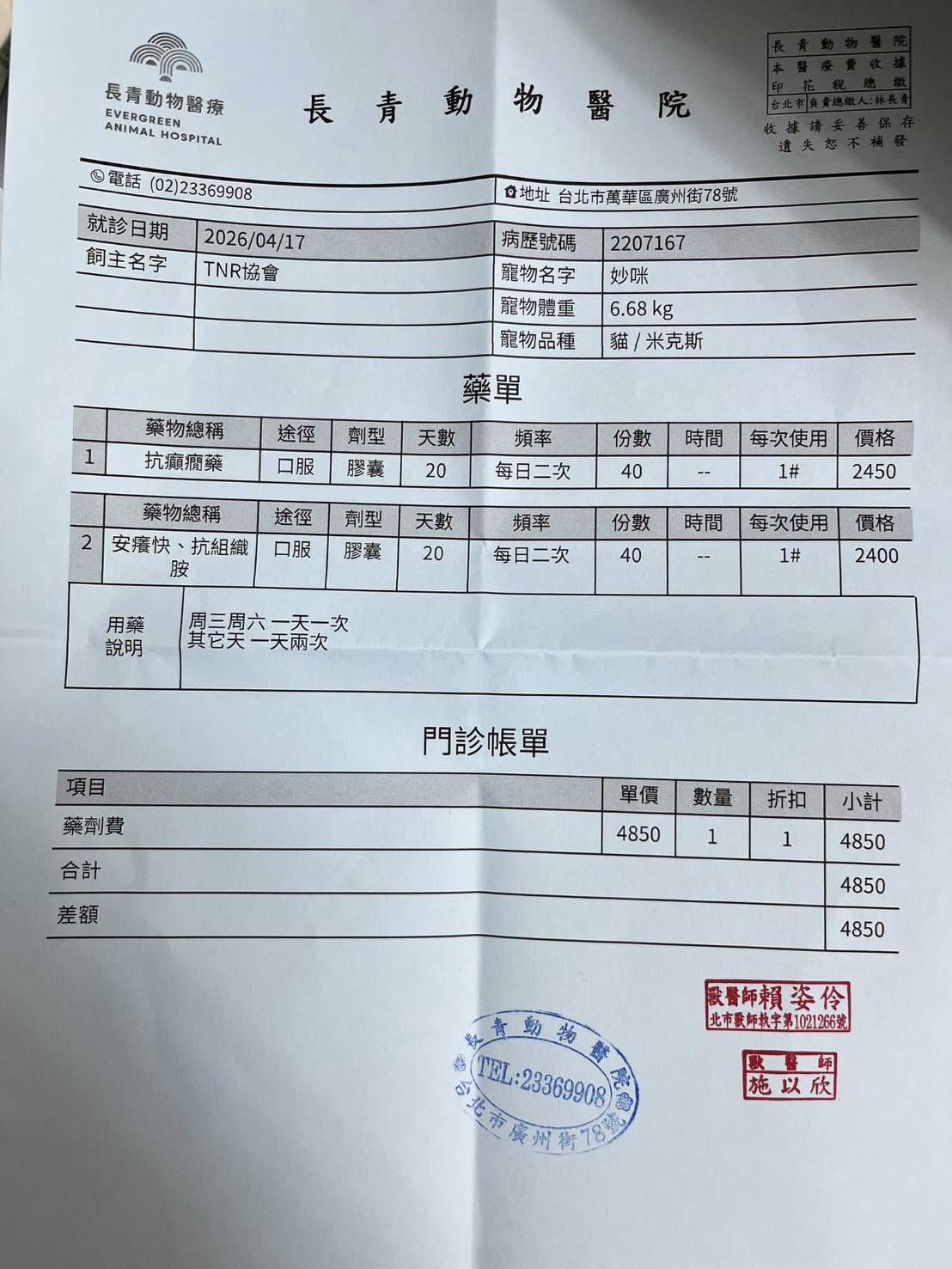 目前妙咪皮膚狀況維持得不錯,因擔心舔毛會誘發癲癇,所以仍須穿著防護衣及戴頭套,治療至今,癲癇發作次數及時間有明顯減少很多,但妙咪的癲癇仍可能會是需要終身吃藥;可憐的妙咪因被壞人傷害造成皮膚相當敏脆弱,並因此造成發作癲癇,還好有協會的救援與安置,讓妙咪能夠有機會接受最好的醫療與照護,妙咪的醫療用藥是終身需求,本筆醫助是自2026年4月17日間至長青醫院取癲癇、止癢用藥的費用。