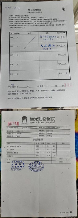 2026年2月27日於沐恩例行回診,醫師表示體重雖然有持續減輕,但血檢均正常可不用擔心,並可以嘗試停抗生素,再多觀察食慾精神情況即可。左眼流淚紅腫情況加開抗組織胺幫助舒緩,先吃一週觀察。