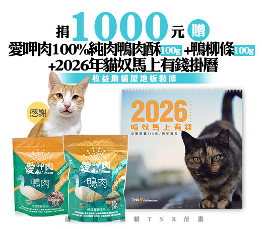 候補人員: 說明: 捐1000元贈愛呷肉100%純肉鴨肉酥(100g)+鴨柳條(100g)+2026年貓奴馬上有錢掛曆