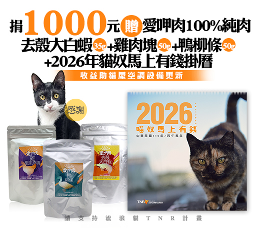 贈品名稱: 捐1000元贈愛呷肉100%純肉去殼大白蝦(35g)+雞肉塊(50g)+鴨柳條(50g)+2026年貓奴馬上有錢掛曆 贈品總數: 30人 每人捐款金額: 1000元 已報名名額: 1 尚需求名額: 29 報名人員: 1.Aeola (已付款)