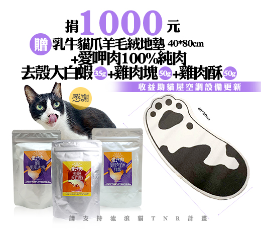 候補人員: 說明: 捐1000元贈乳牛貓爪羊毛絨地墊(40*80cm)+愛呷肉100%純肉去殼大白蝦(35g)+雞肉塊(50g)+雞肉酥(50g)