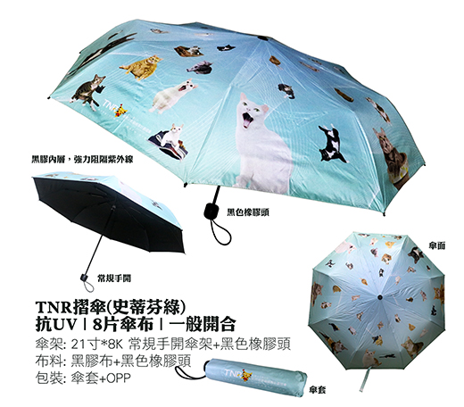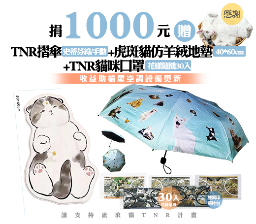 候補人員: 說明: 捐1000元贈TNR摺傘(史蒂芬綠/手動)+虎斑貓仿羊絨地墊(40*60cm)+TNR貓咪口罩(花樣隨機30入)