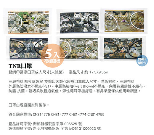 外層為防潑水不織布(PET),中層為熔噴(Melt Blown)不織布,內層為親膚性不織布,防塵 抗菌,輕巧柔軟且透氣佳。彈性繩耳帶極舒適,有鼻梁壓條供使用時調整。